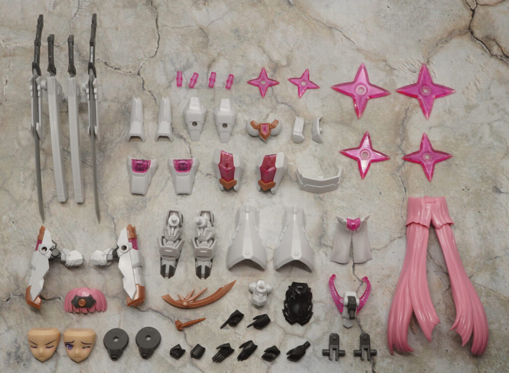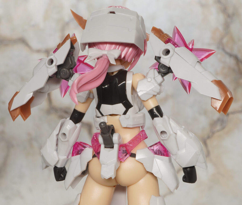 白い部分はパールホワイトな成形色で、各所のピンクは偏光樹脂っぽいキラキラした色合いのクリアパーツで造形。