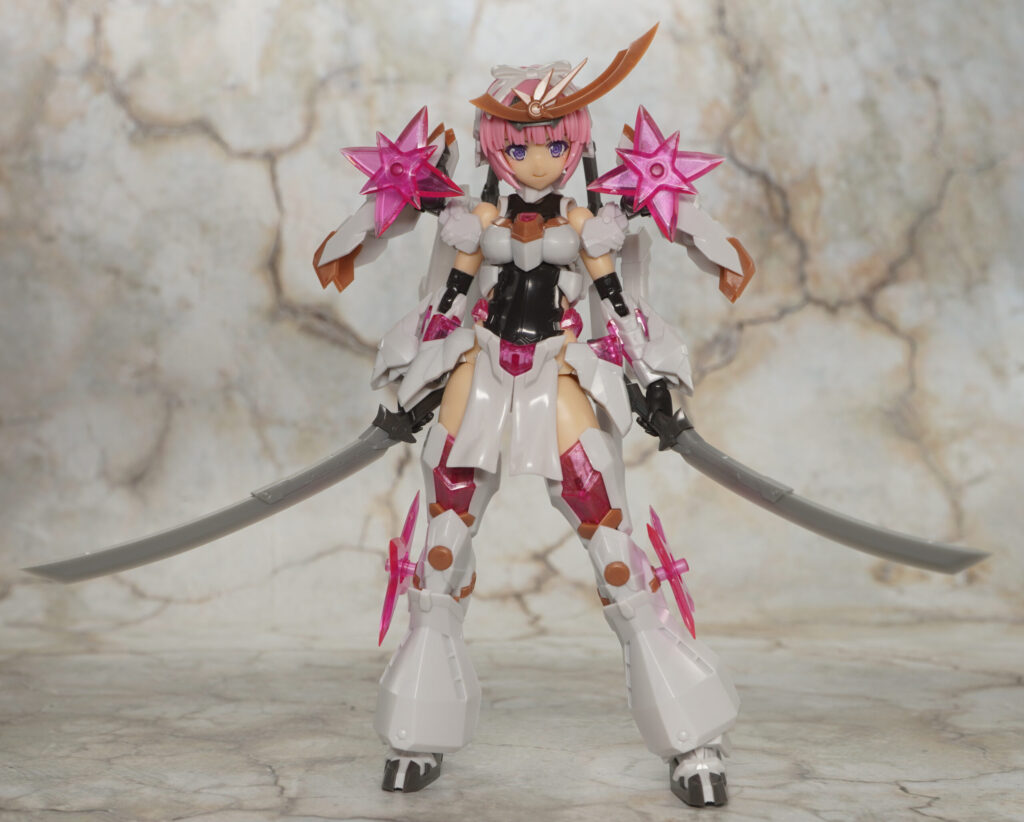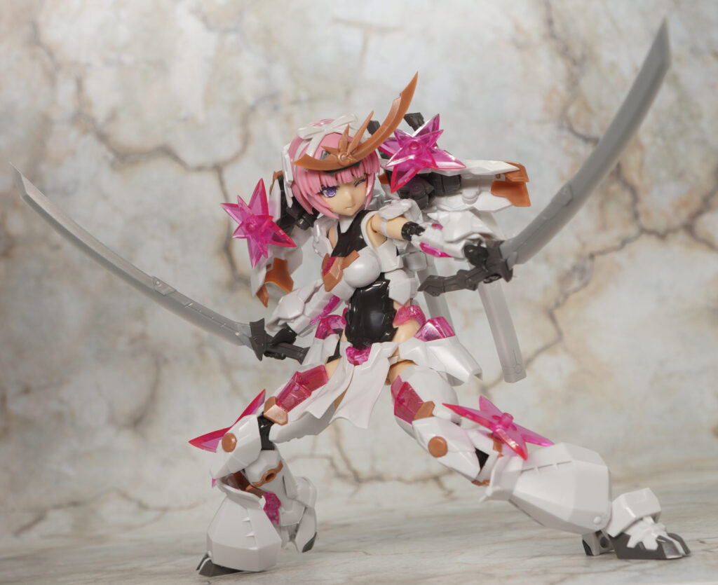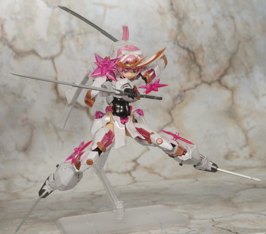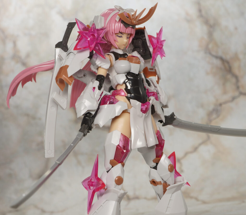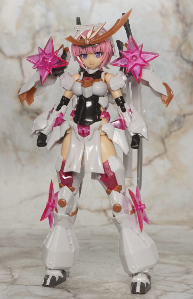 こちらが完成した【フレームアームズ・ガール】マガツキ[橘花]のくノ一モードです。マガツキシリーズのバリエーションで、通常版とは対照的な白、金、ピンクでファンシーな色合いになった橘花(きっか)。