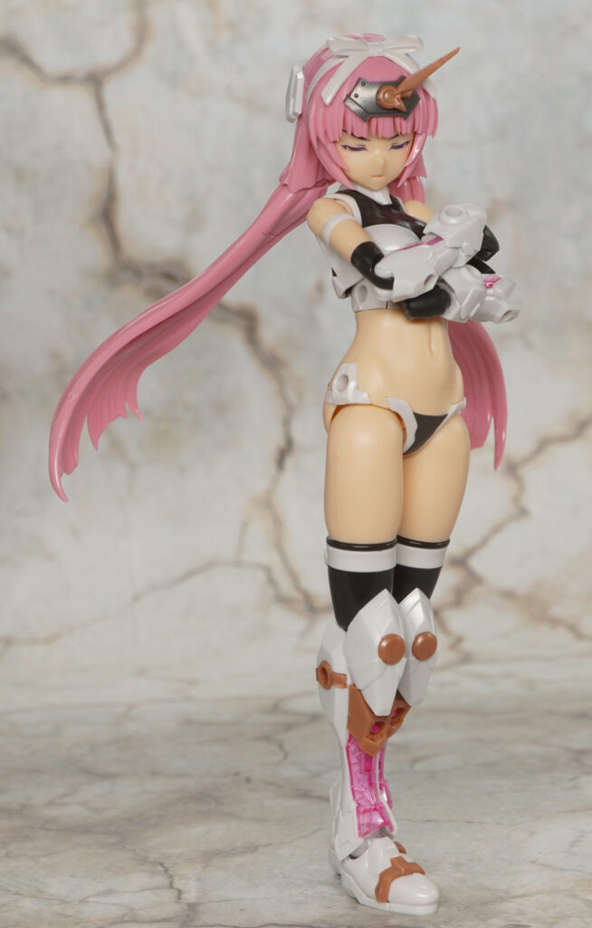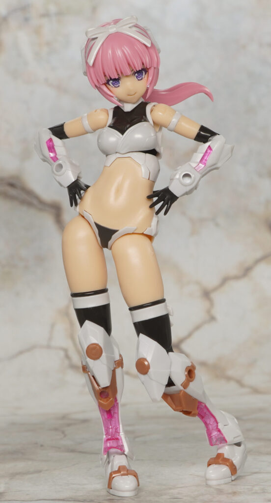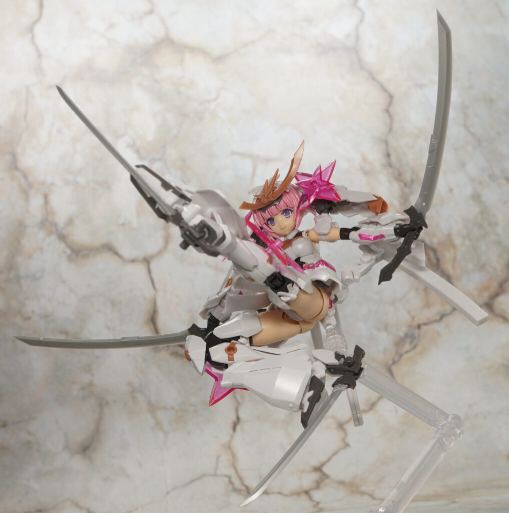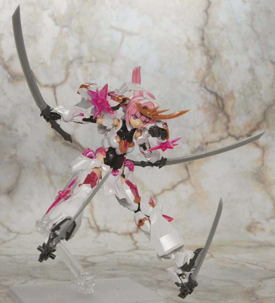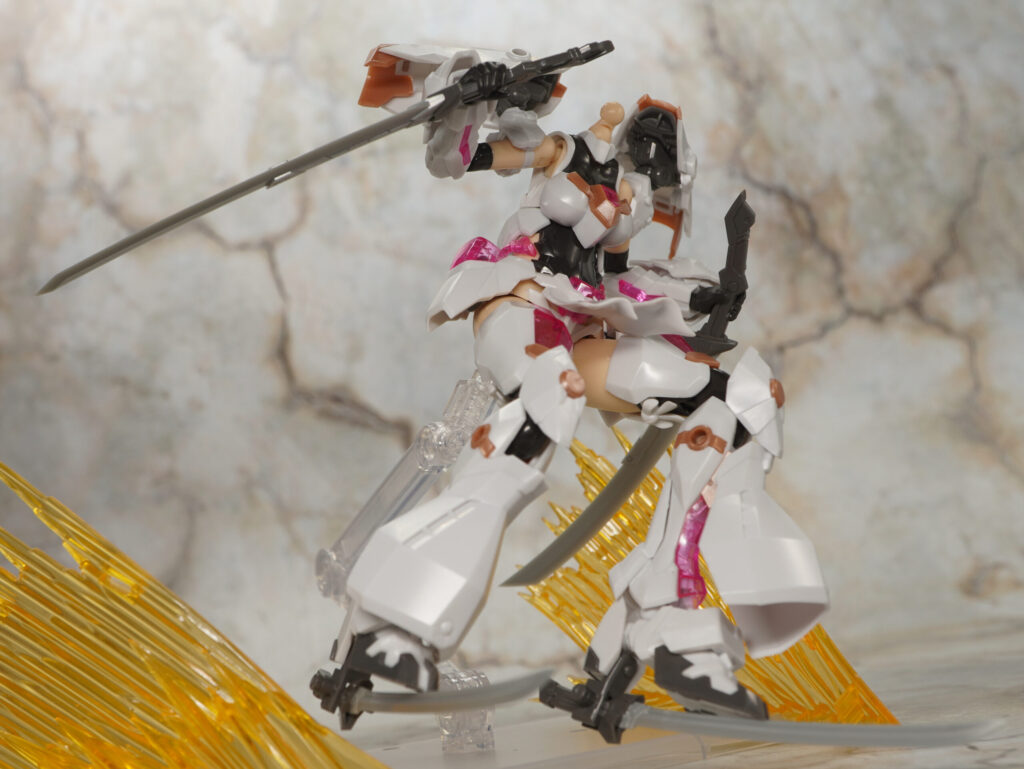 こちらが完成した【フレームアームズ・ガール】マガツキ[橘花]のくノ一モードです。マガツキシリーズのバリエーションで、通常版とは対照的な白、金、ピンクでファンシーな色合いになった橘花(きっか)。