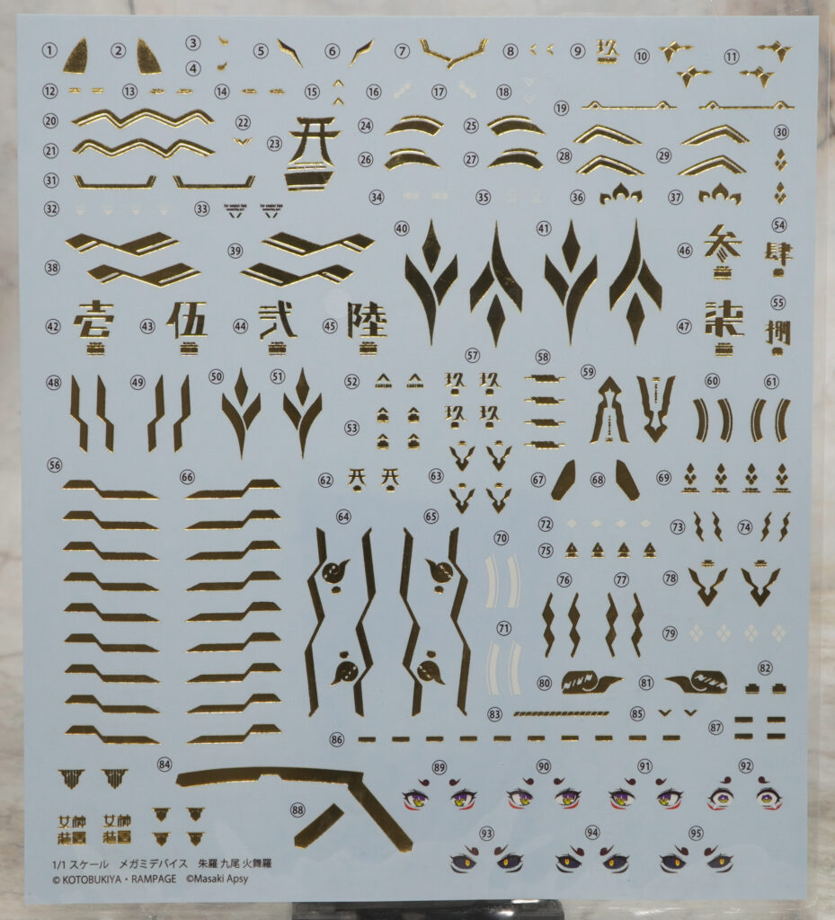 パッケージと水転写デカール。瞳や各所の金色模様などを再現できる火舞羅用に新調されたデカールが付属。