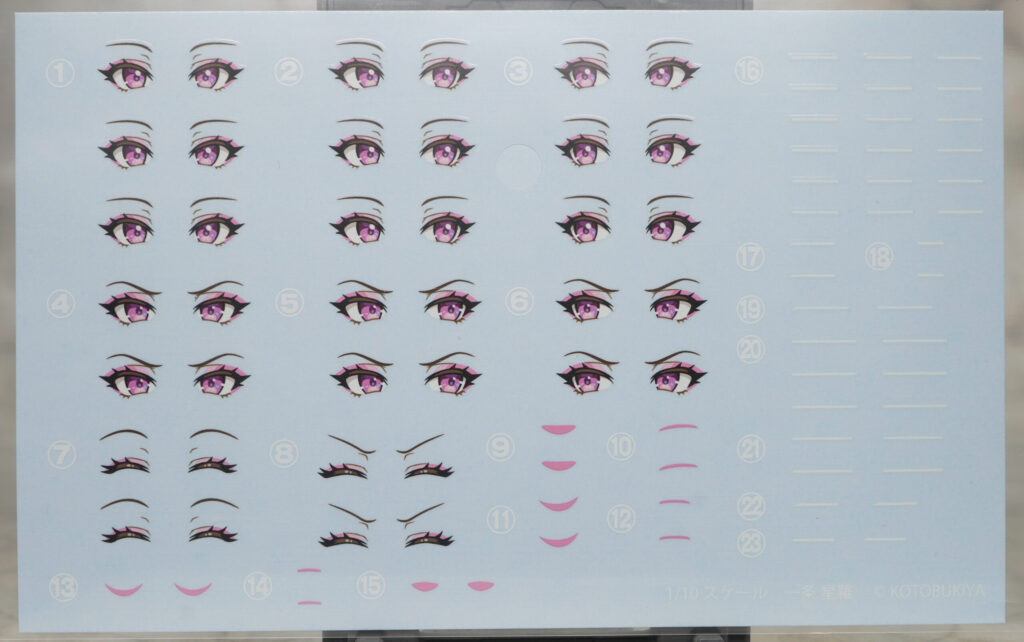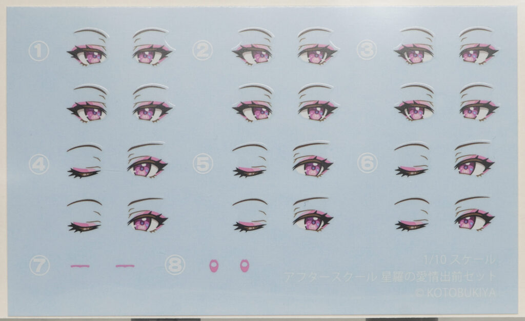 表情を再現できる水転写デカールが2枚付属しており、新規ではなく”一条 星羅(令法高等学校・夏服)”や”アフタースクール 星羅の愛情出前セット”のと同じ物です。