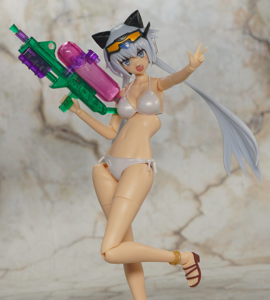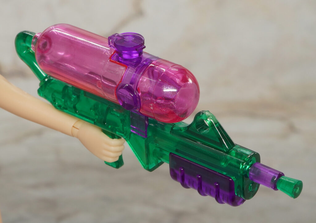 付属品は表情パーツ×3種、無地表情×6種、ハンドパーツ×13種、メガネ対応前髪、足首×3種、座り姿用ボディ、固定式脚部、ウォーターアームズ(ポンプアクション式ライフルタイプ)、メガミデバイス対応首関節、展示ベースです。