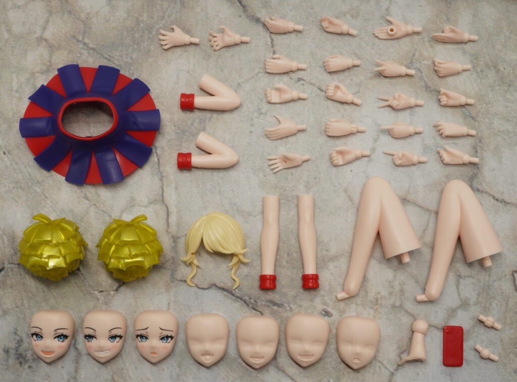 付属品は表情パーツ×4種、無地表情×4種、ハンドパーツ×12種、メガネ対応前髪、固定ポーズ用腕×2種、固定ポーズ用脚、スカート、ポンポン×2、スマホ、メガミデバイス対応首関節、展示ベースです。