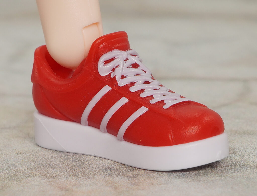 こちらはヒザが動く可動脚で、赤いシューズの白ラインや紐は塗装済パーツで色分けされているぞ!