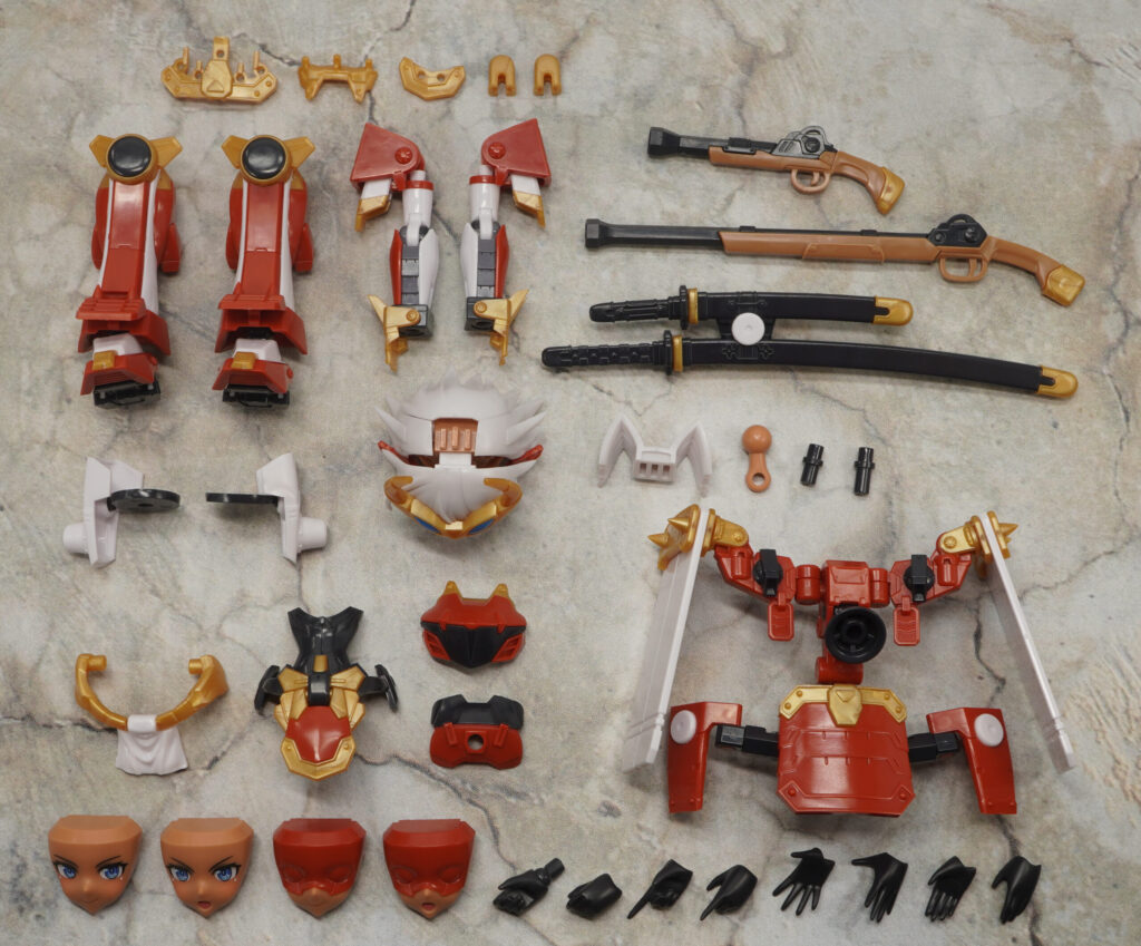 付属品は表情パーツ×5種、ハンドパーツ×5種、武装モード一式、前掛け、エアダクト型髪、長銃、短銃、脇差、太刀、メガミデバイス対応首関節、展示ベースです。