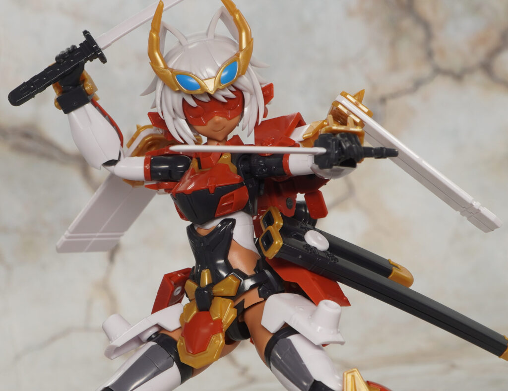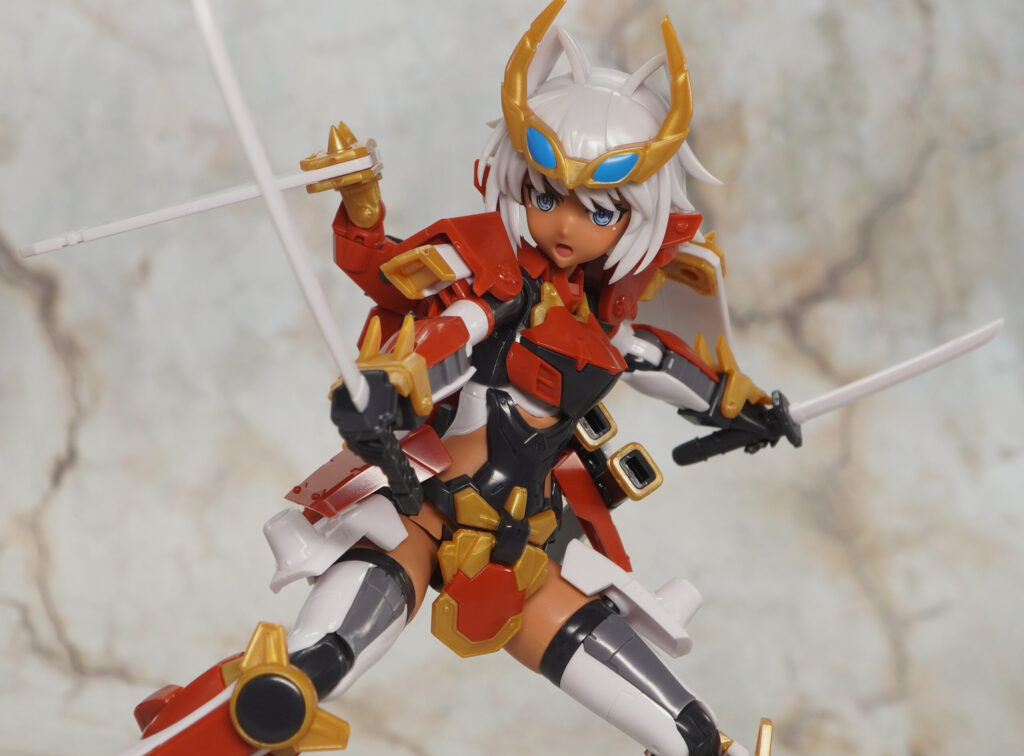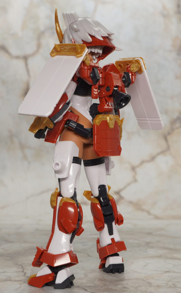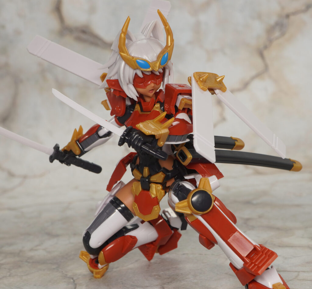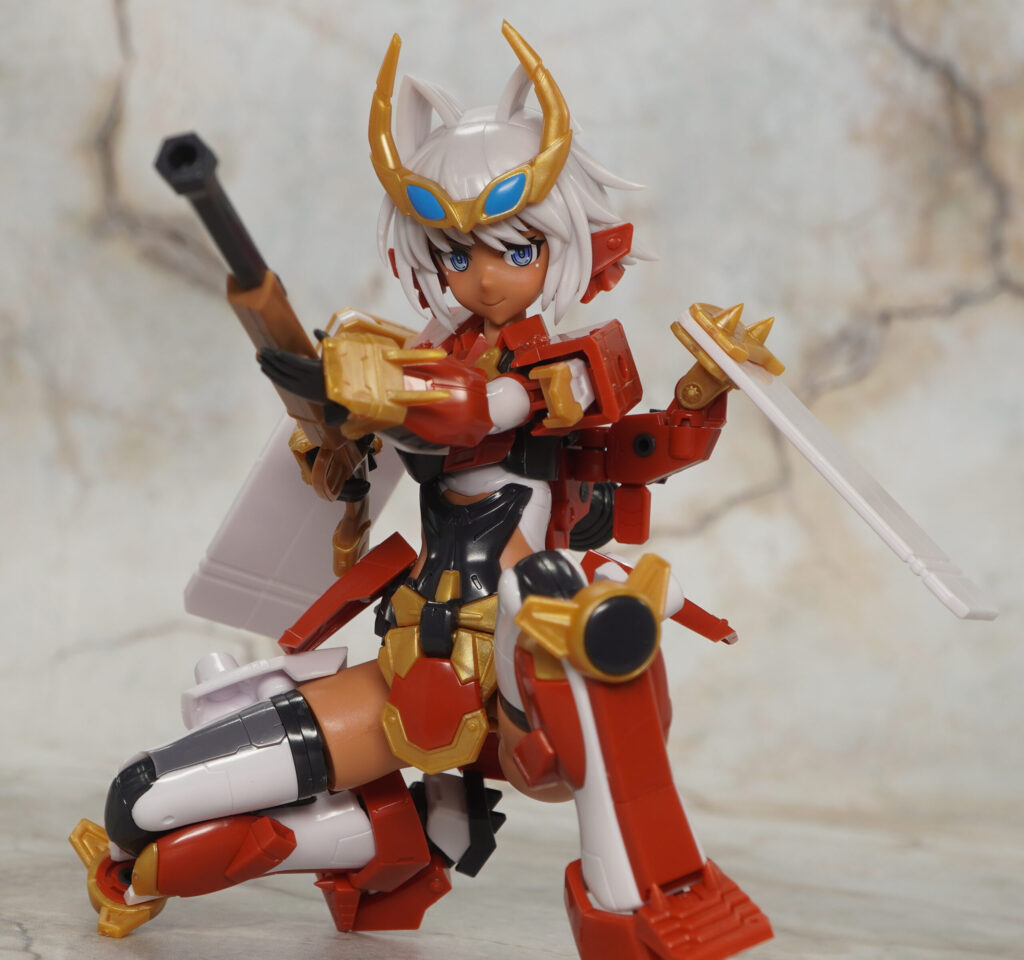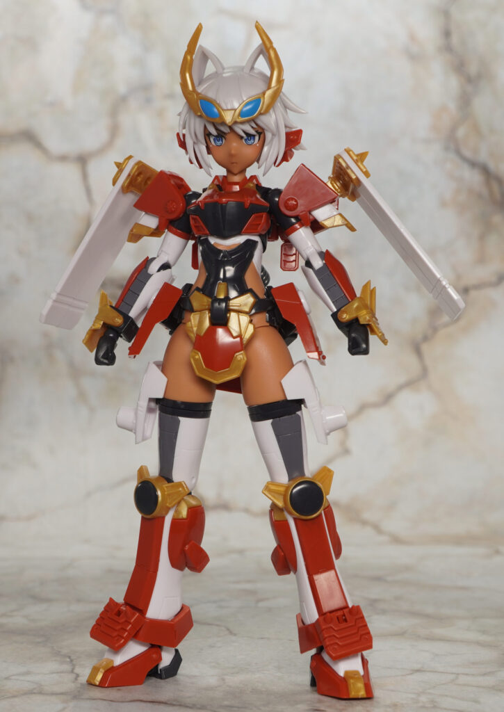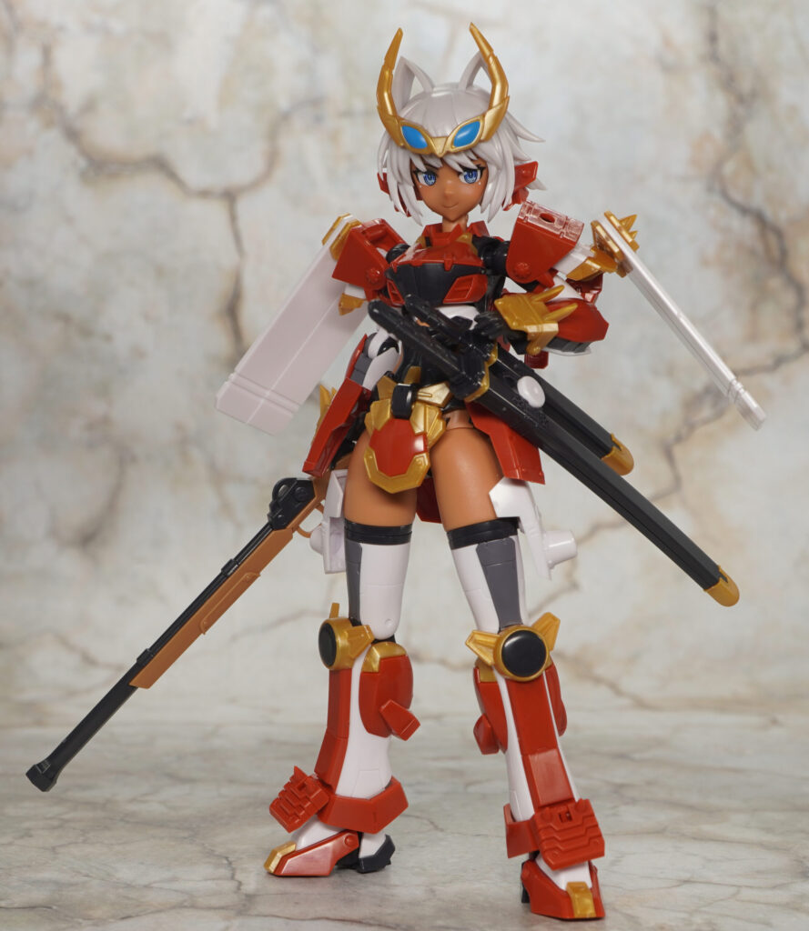 こちらが完成した【フレームアームズ・ガール】信玄(しんげん)の素体モードです。信玄いうことで日本刀や銃、兜、旗印など戦国大名をイメージした武器やアーマーを備えたFAガール。