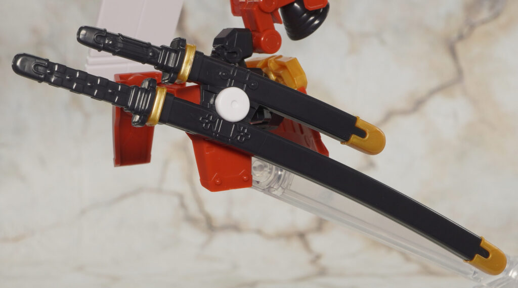 太刀と脇差が付属し、差し替え無しで納刀可能。