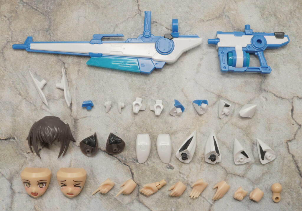付属品は表情パーツ×3種、ハンドパーツ×5種、スマートガン、ハンドマシンガン、黒メカ猫耳、耳アクセサリ一式、軸ピン付きフィンパーツ、アクセサリ無し前髪、メガミデバイス対応首関節、展示ベースです。