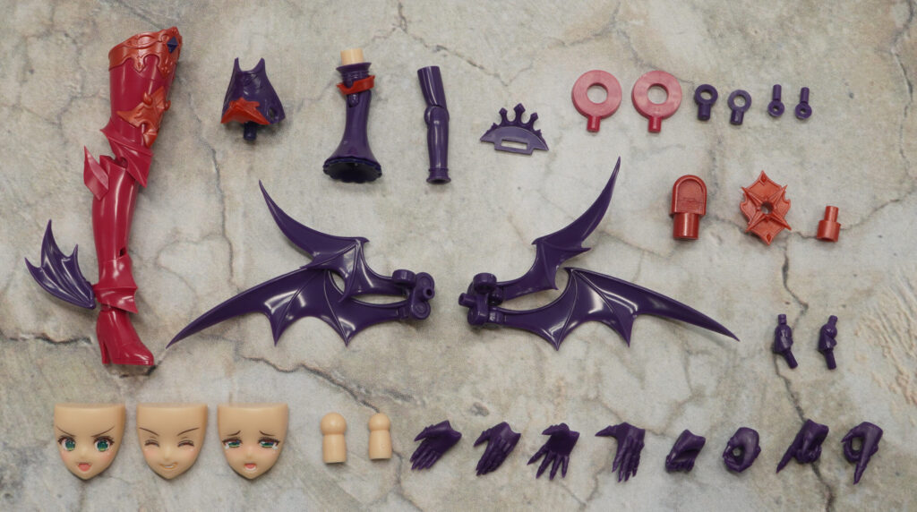 付属品は表情パーツ×4種、ハンドパーツ×5種、ウィライズモード一式、FAガール・メガミデバイス対応首関節、二の腕・太もも用3ミリ軸リングジョイント、角度付き手首関節×2、背部魔法陣パーツ、スタンドジョイント延長パーツです。