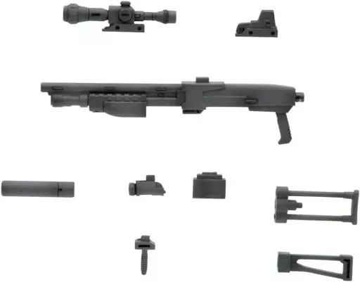 キットの内容はショットガン本体、マガジン、サイレンサー、フォアグリップ、ライト、センサー、スコープサイト、固定ストック、可動ストックです。