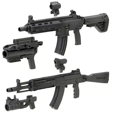 キットの内容はアサルトライフル本体×2種、照準器×2種、グレネードランチャー×2種です。