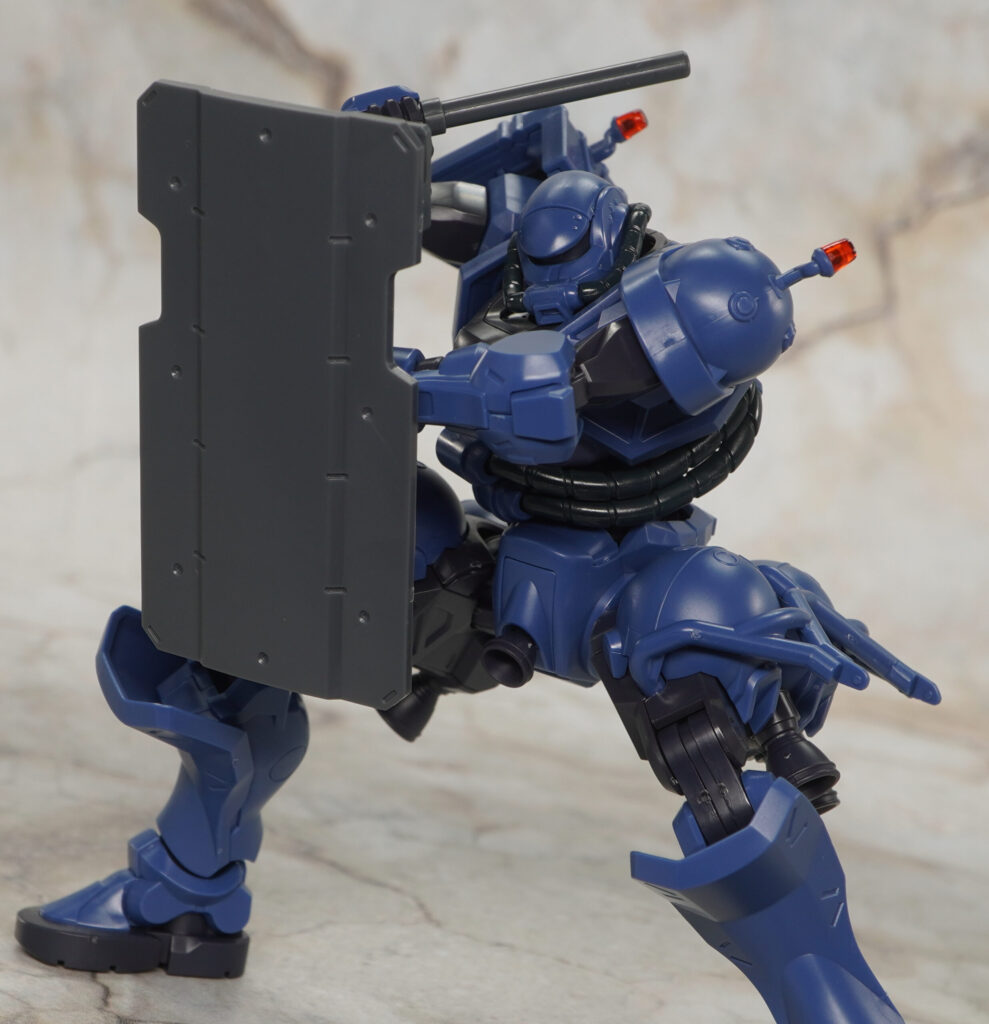 最近のガンプラだとハンドパーツが合わなくて警棒はユルユルなのと、武器やシールドのグリップは握れないので軸ピンで接続してます。