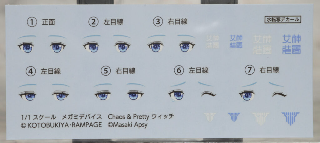 パッケージと水転写デカール。表情を再現できるデカールと武装モードのアーマーを色分けするシールが付属。