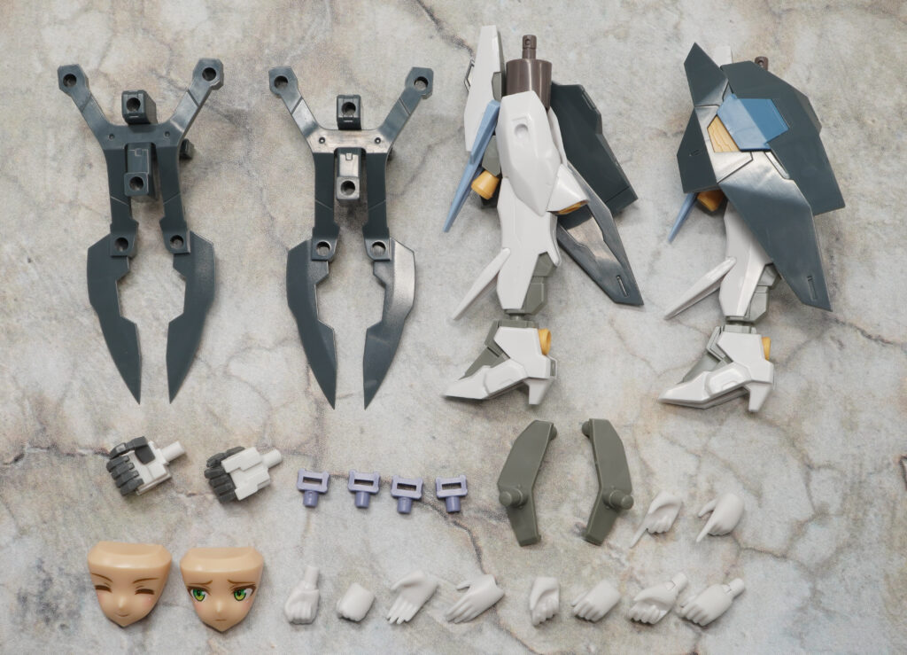 付属品は表情パーツ×3種、ハンドパーツ×6種、武装モード一式、ガンレイピア(ハンドガン)×4、ブラストシールド基部パーツ×2、メカハンド、ガンレイピア用アタッチメント×4、3mmアタッチメント×2、展示ベースです。