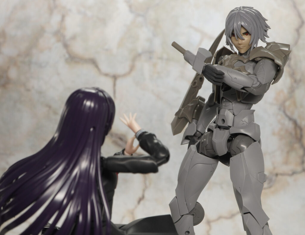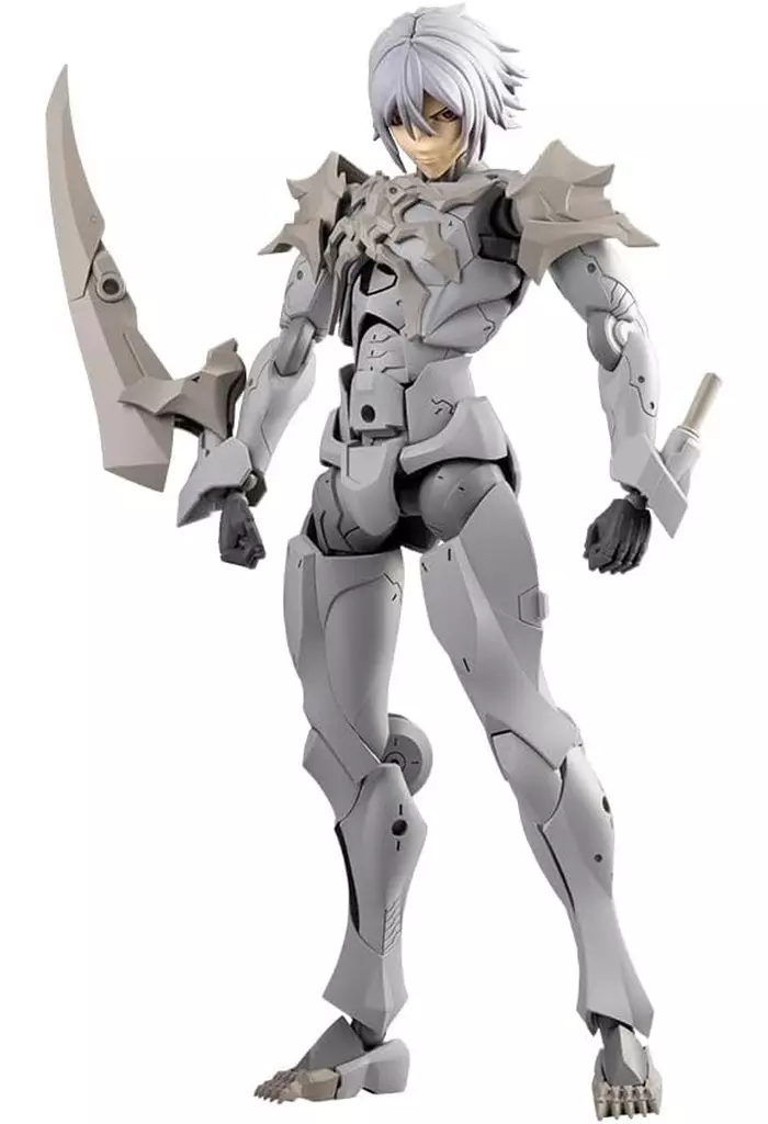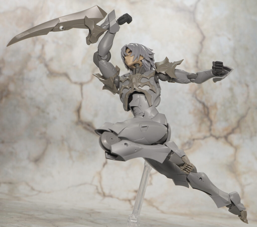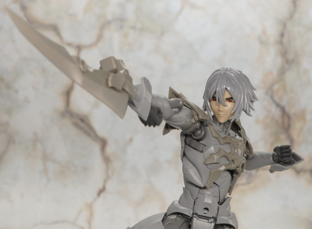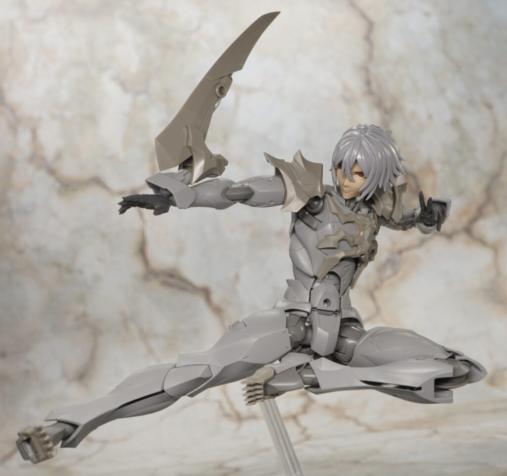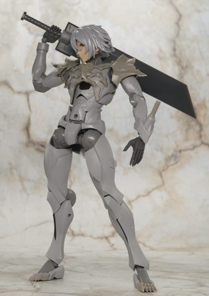 同じく男性キャラクターのメフィスト素体をベースに頭部や首、胸&肩アーマー、つま先が新規造形で、ヘキサギアシリーズ流用の大型アームブレードを腕部に装着できるぞ!