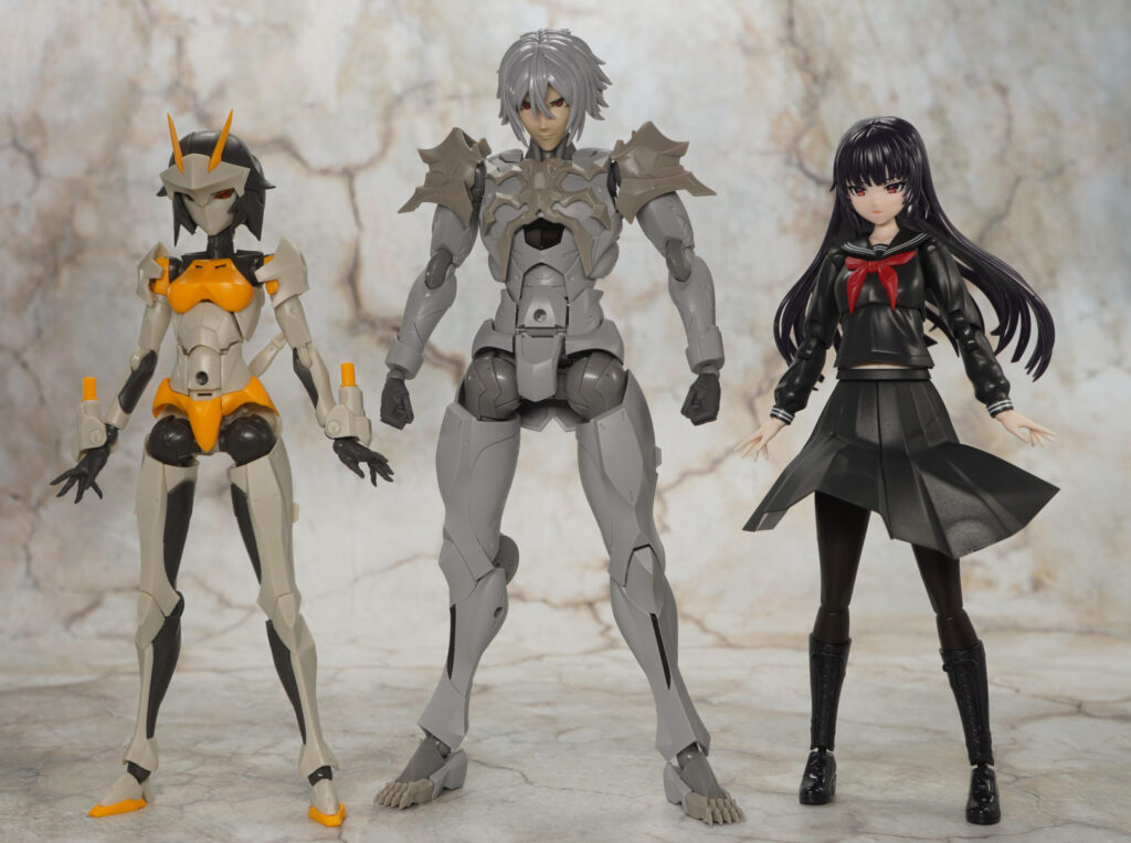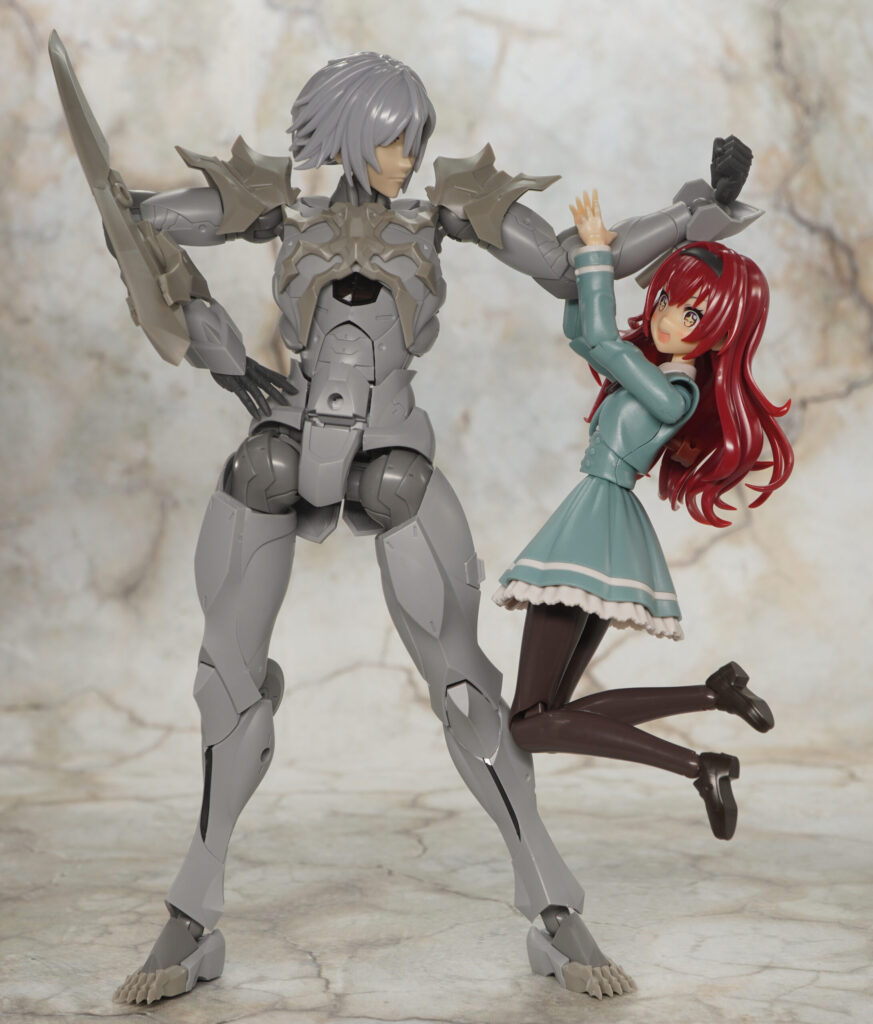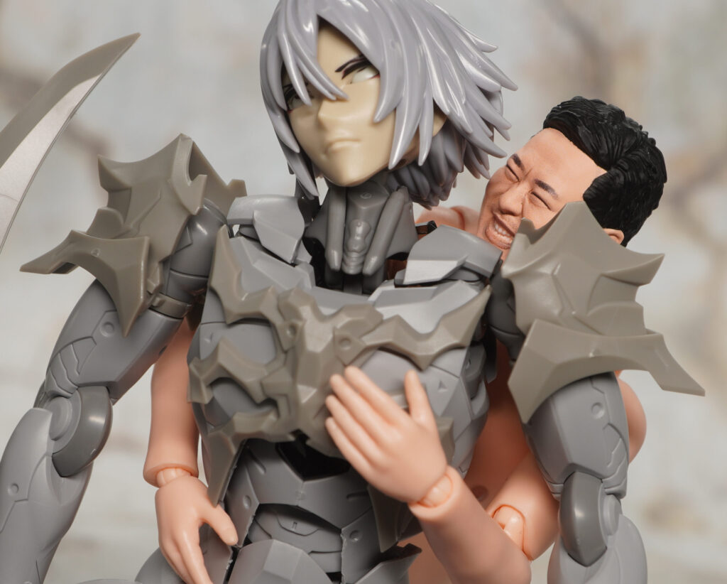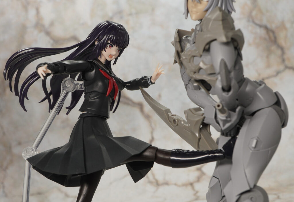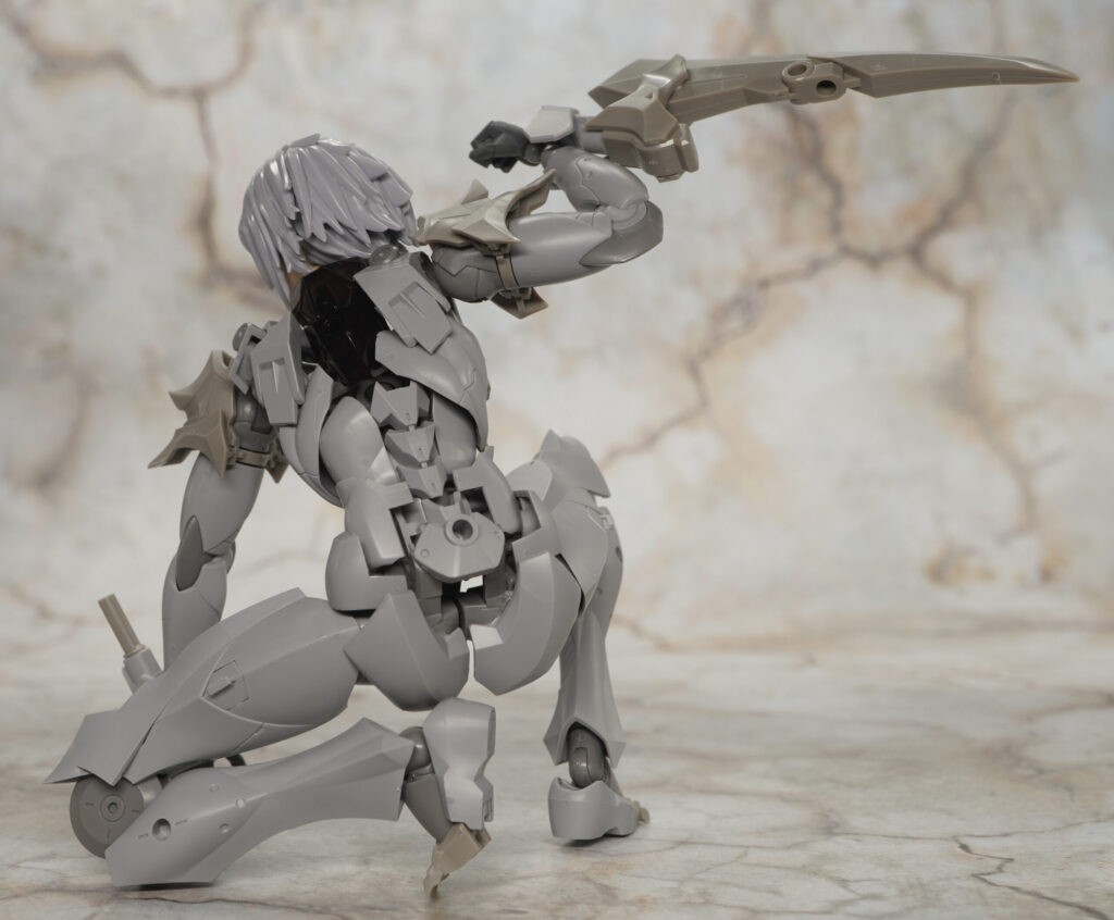 同じく男性キャラクターのメフィスト素体をベースに頭部や首、胸&肩アーマー、つま先が新規造形で、ヘキサギアシリーズ流用の大型アームブレードを腕部に装着できるぞ!