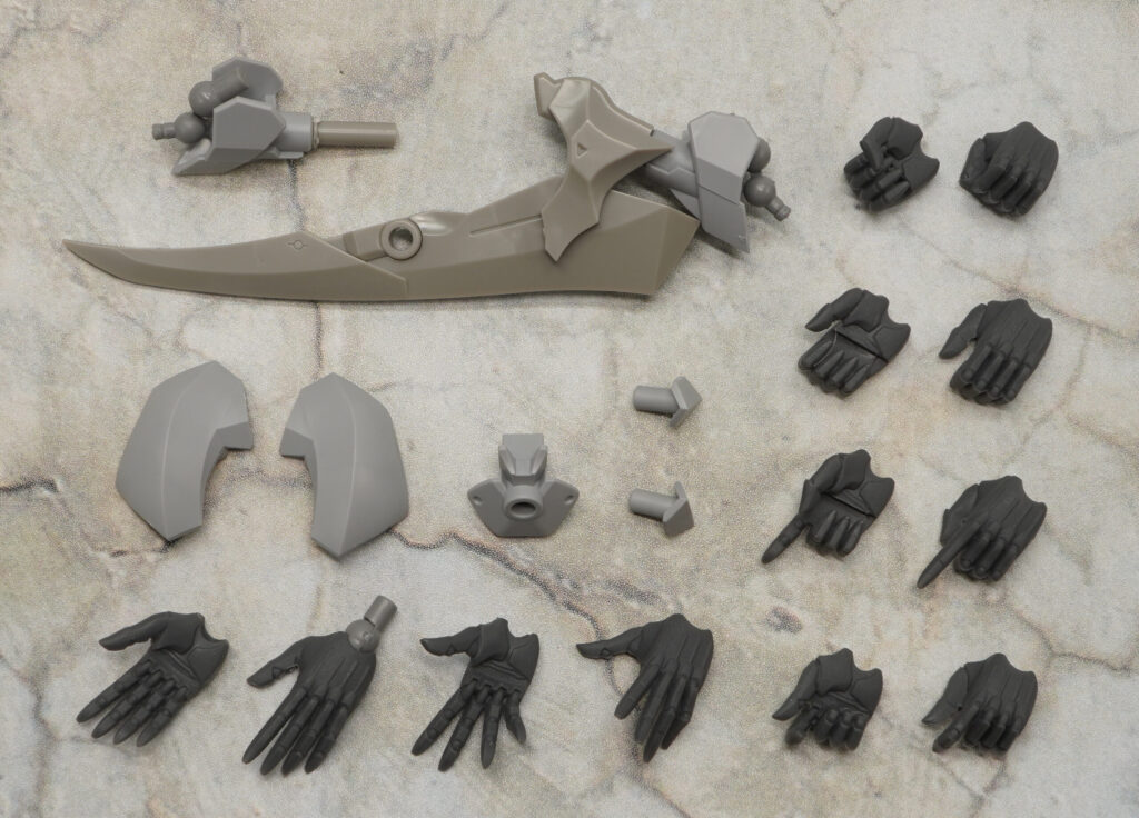 付属品はハンドパーツ×7種、大型アームブレード、三連リストジョイント、独立可動腰装甲、眼球可動治具です。