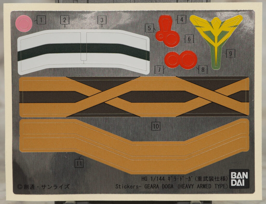パッケージとシール。モノアイやネオ・ジオンエンブレム、シールドの白ライン、バックパックの赤い部分や連結マガジンのテーピングを再現できるホイルシールが付属。