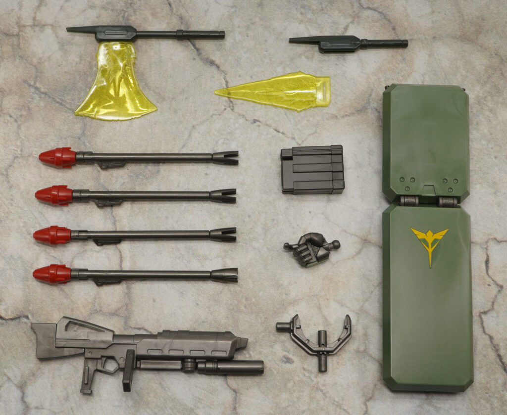 付属品はビーム・マシンガン、ビーム・ソード・アックス×2種、シールド、シュツルム・ファウスト×4、右銃持ち手、シングルタイプマガジンです。