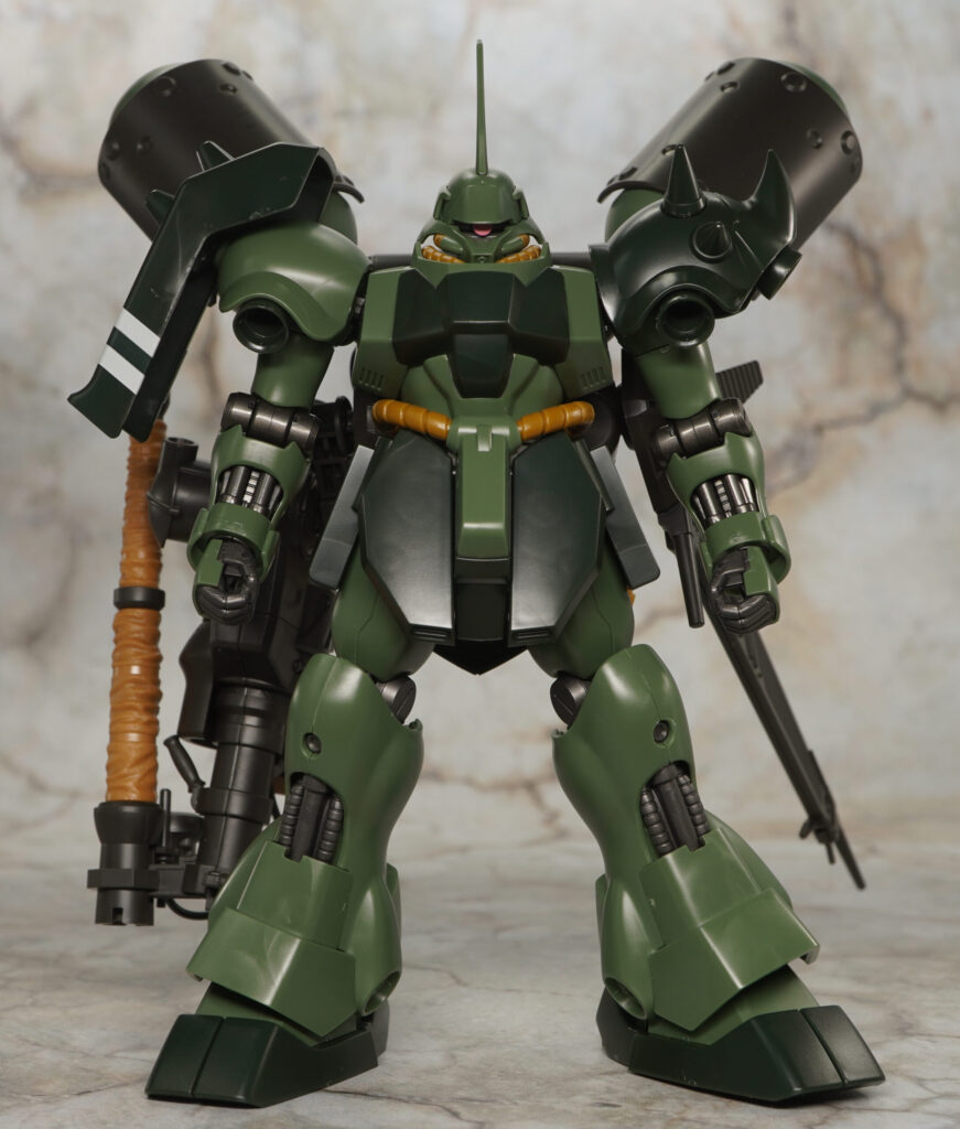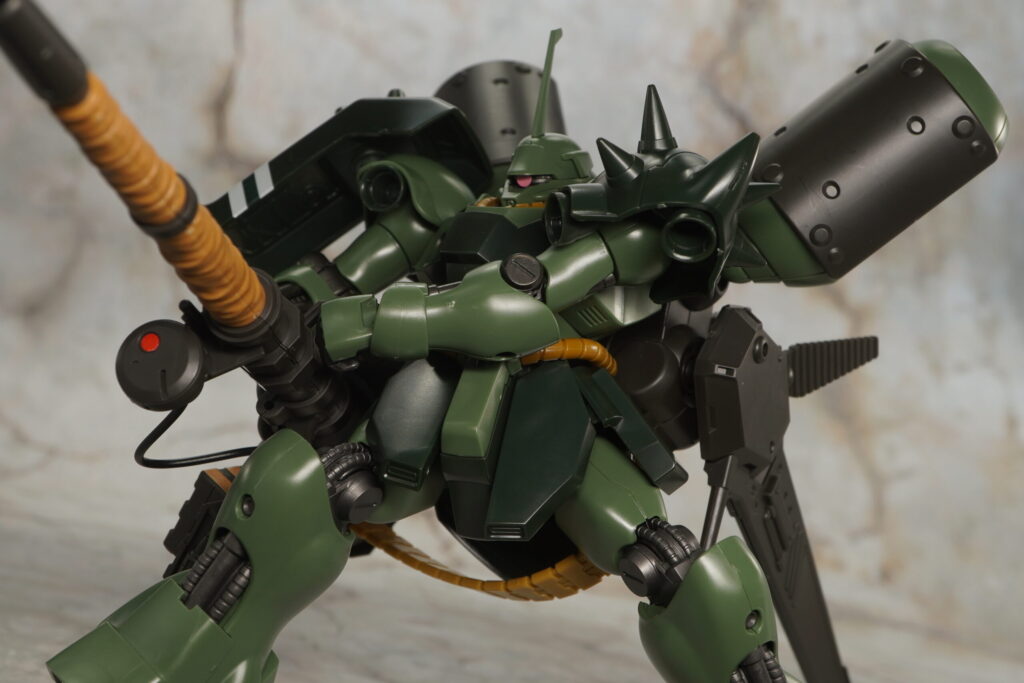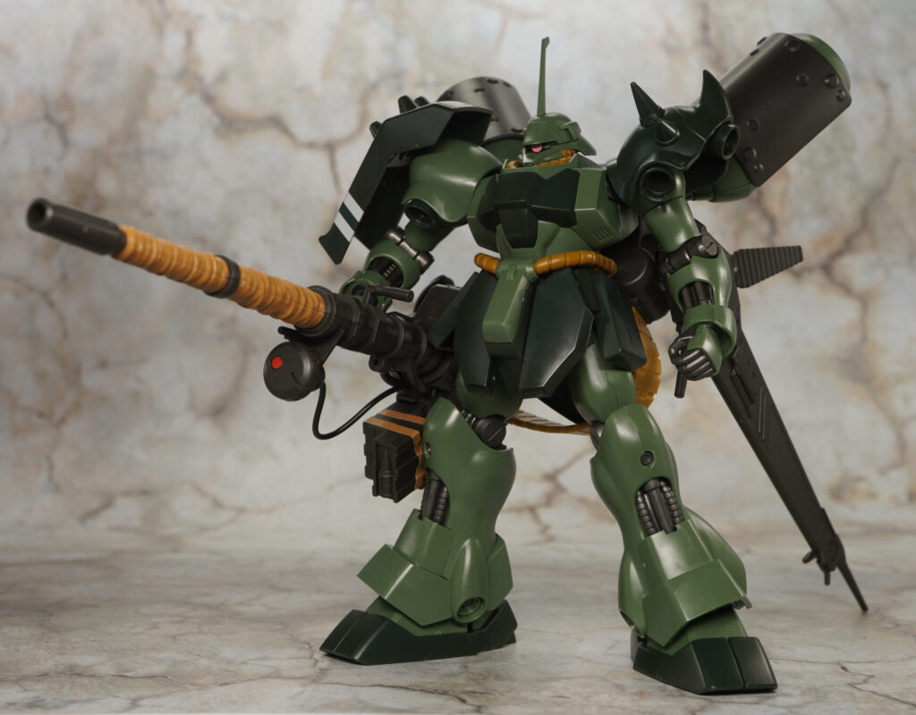 こちらが完成した【HGUC】ギラ・ドーガ(重武装仕様)です。動戦士ガンダム 逆襲のシャア」の模型企画CCA-MSVにて設定されたギラ・ドーガのバリエーション機で、重武装仕様いうことでランゲ・ブルーノ砲や大型プロペラントタンクなどを追加装備したギラ重。