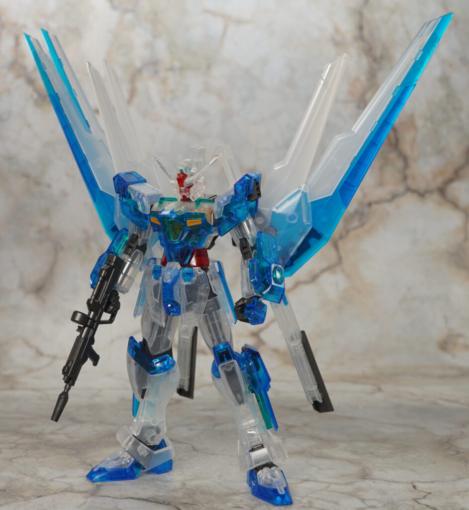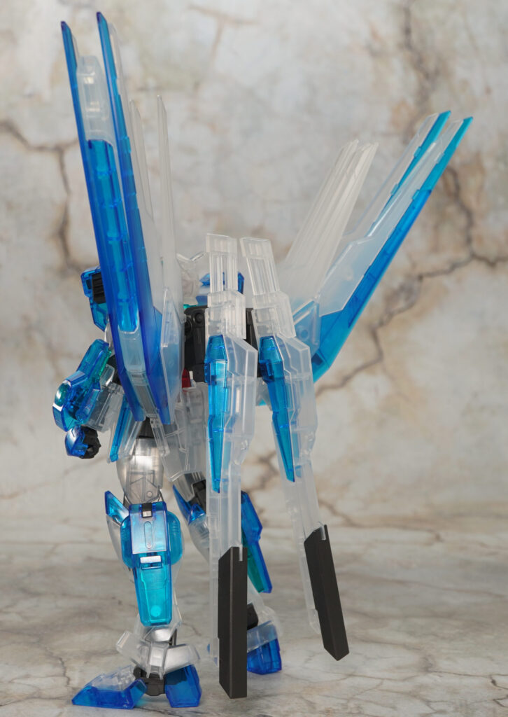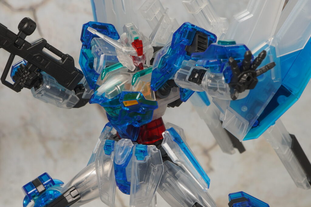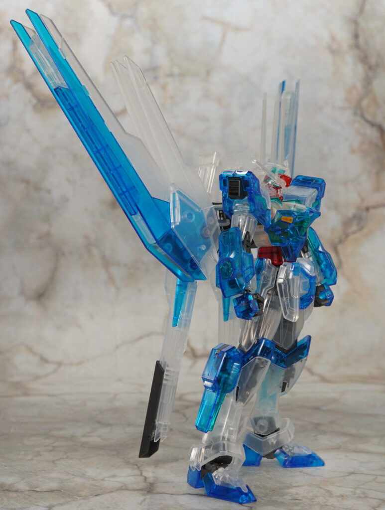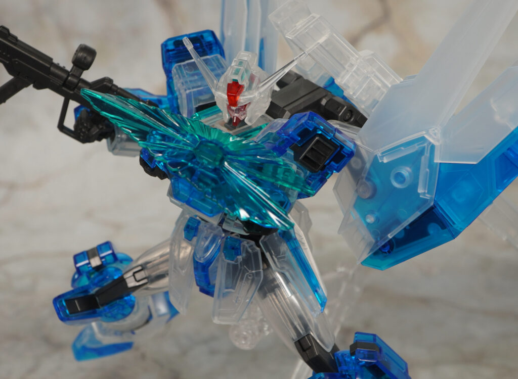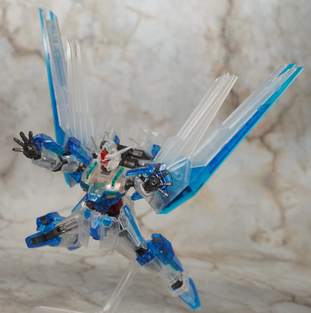 こちらが完成した【HGGBB】ガンダムヘリオス[クリアカラー]です。「ガンダムブレイカー バトローグ」に登場するフドウ・リュウセイがHGCEデスティニーガンダムをベースにフリーダムガンダムの翼やガンダムXのサテライトキャノン、ユニコーンガンダムのサイコフレームから着想を得たクリアパーツなどを集結してビルドしたガンプラ。