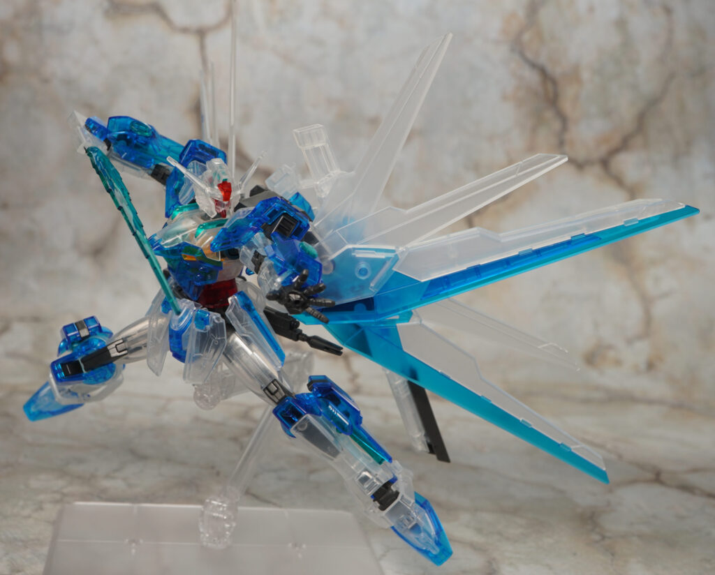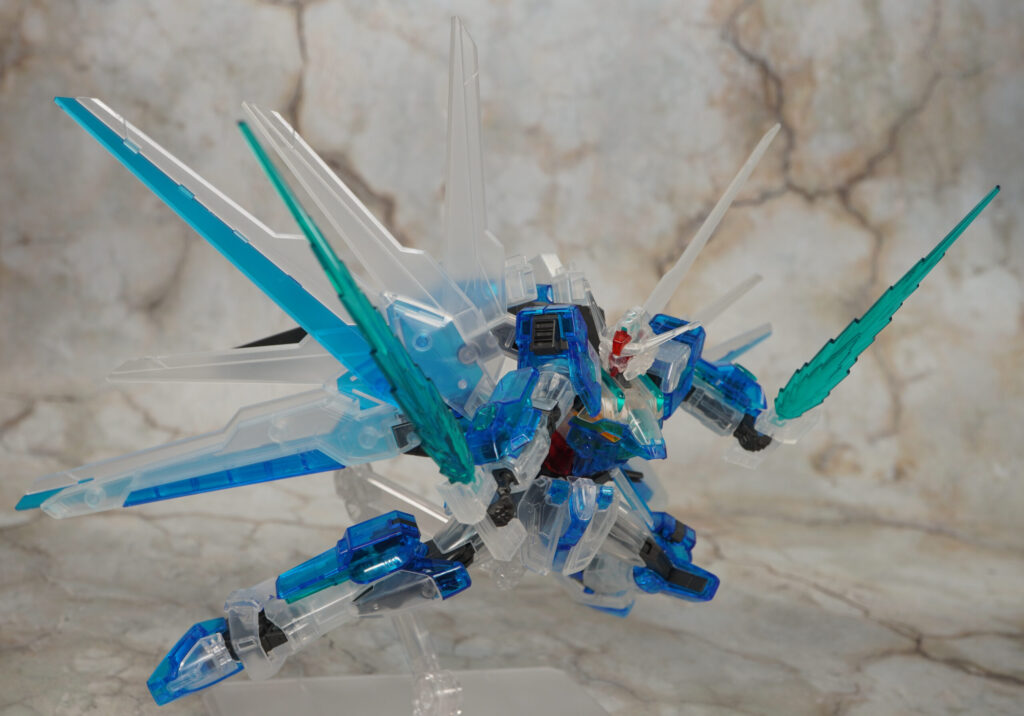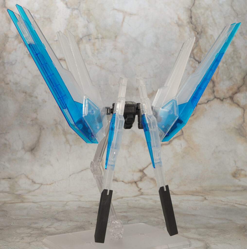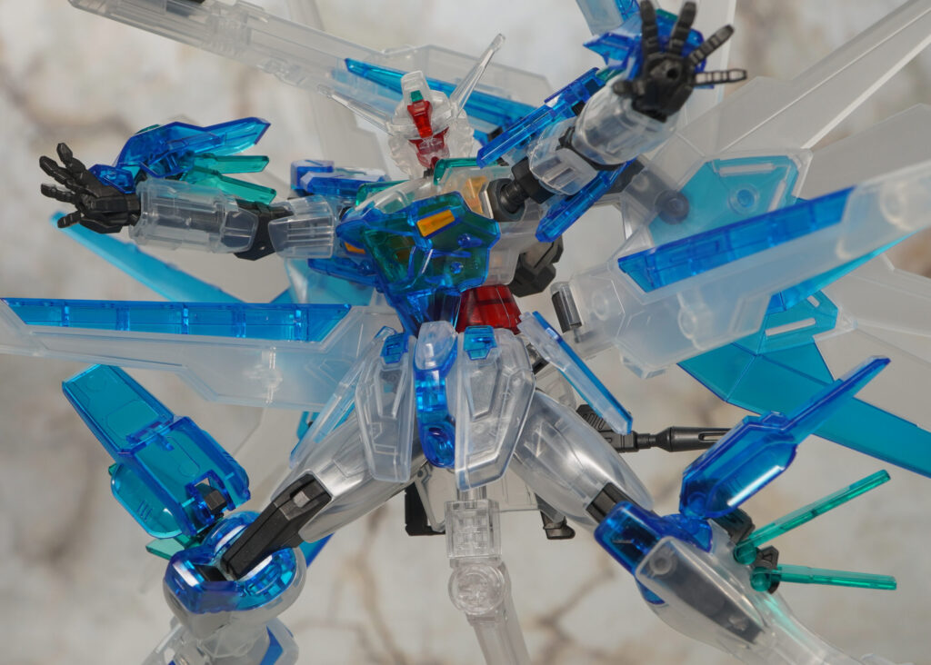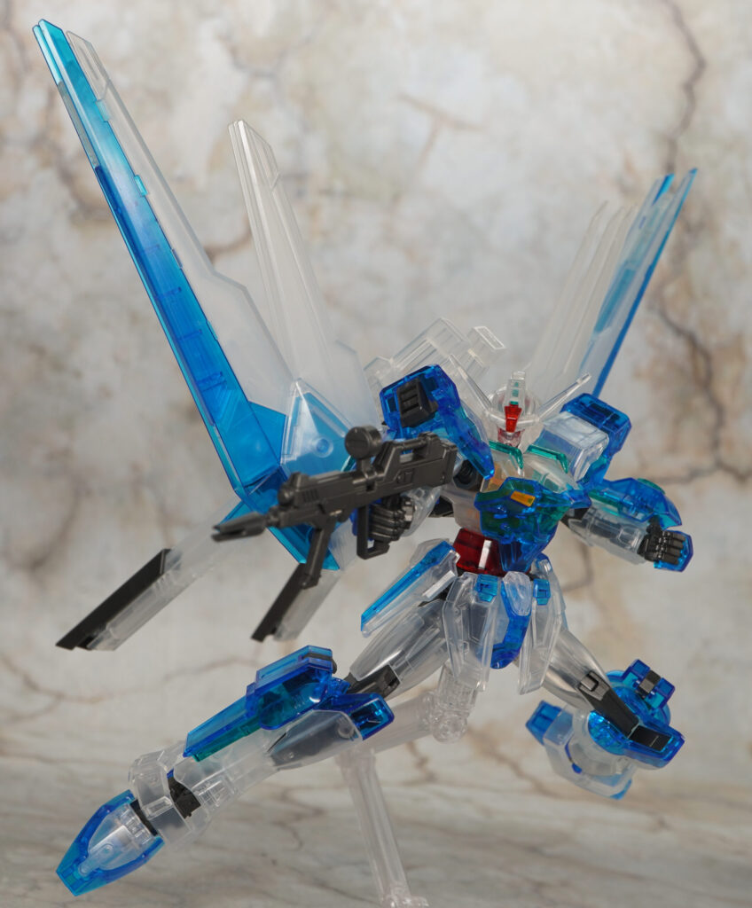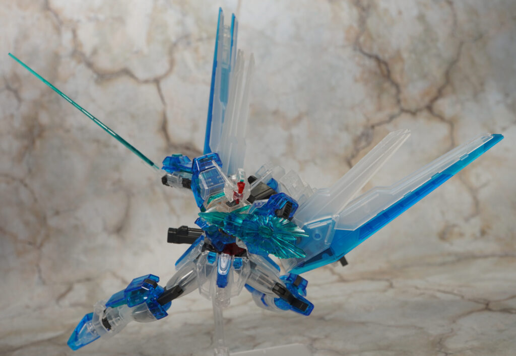 こちらが完成した【HGGBB】ガンダムヘリオス[クリアカラー]です。「ガンダムブレイカー バトローグ」に登場するフドウ・リュウセイがHGCEデスティニーガンダムをベースにフリーダムガンダムの翼やガンダムXのサテライトキャノン、ユニコーンガンダムのサイコフレームから着想を得たクリアパーツなどを集結してビルドしたガンプラ。
