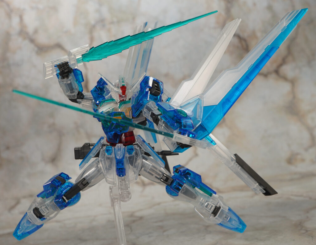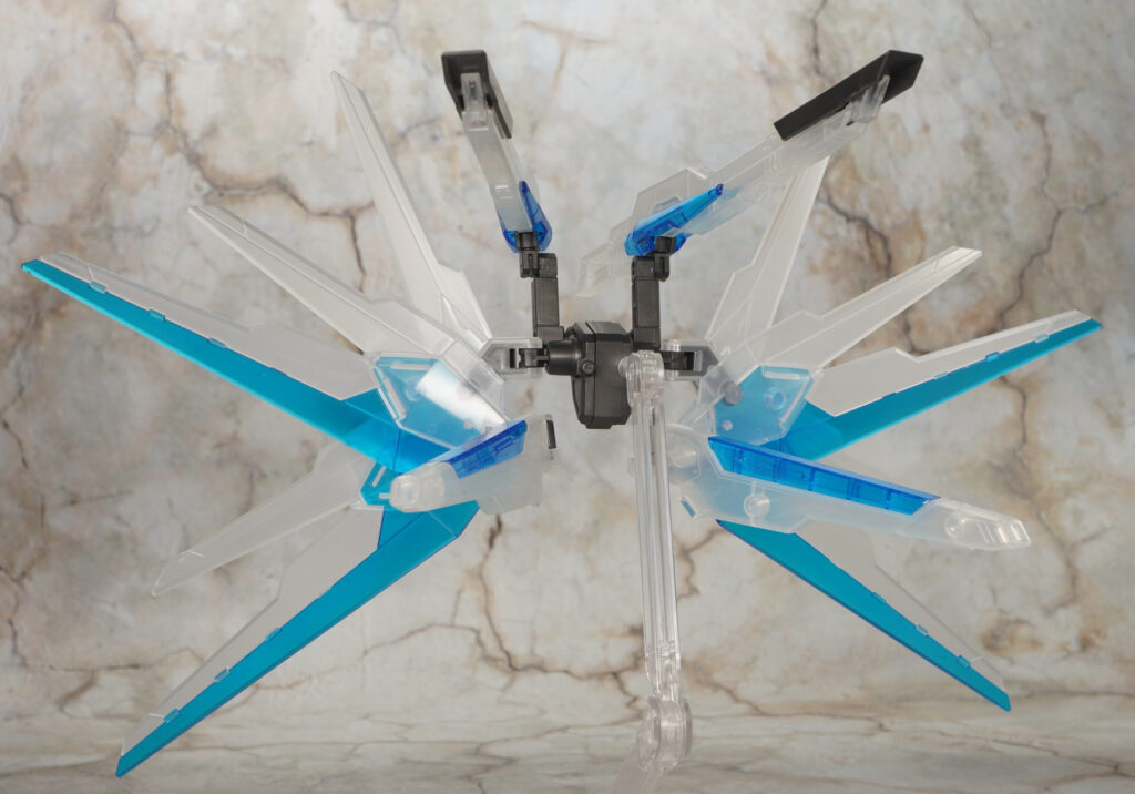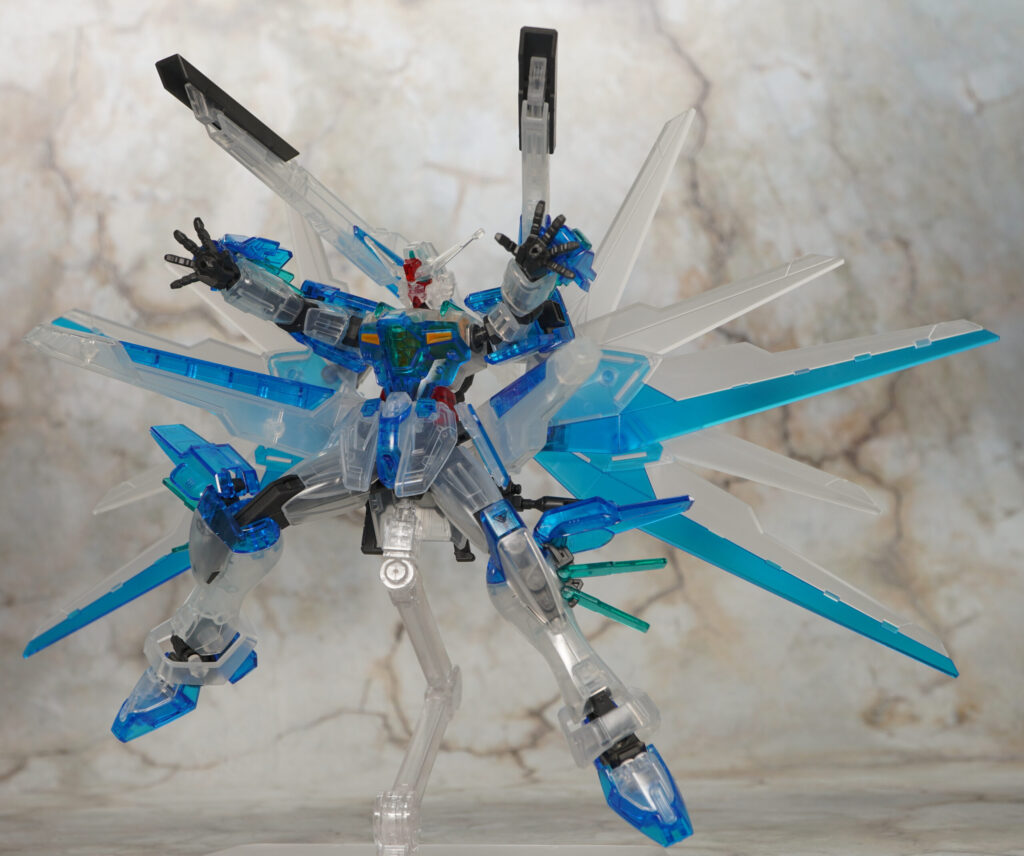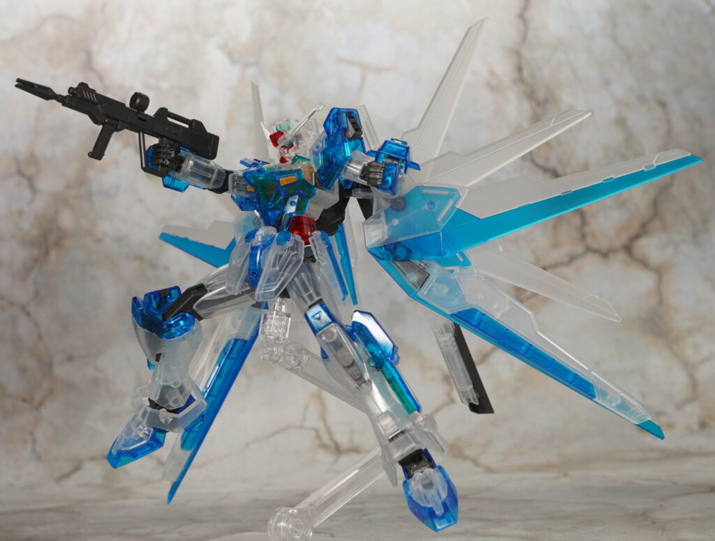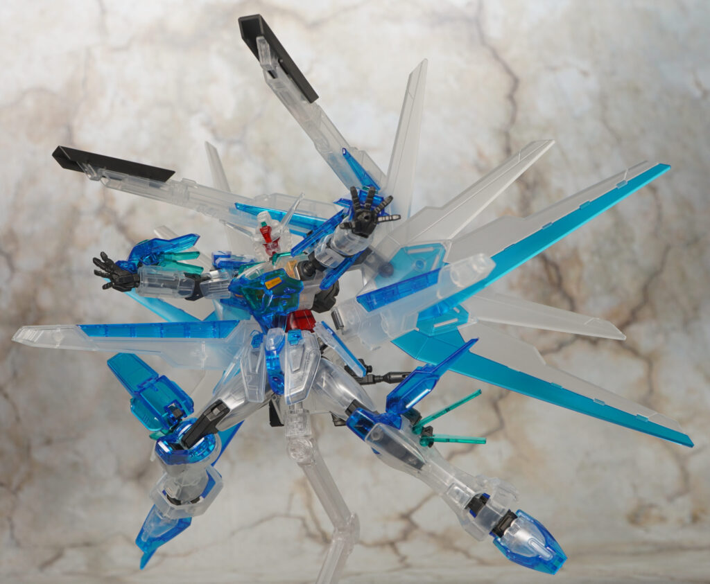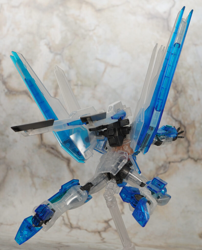 こちらが完成した【HGGBB】ガンダムヘリオス[クリアカラー]です。「ガンダムブレイカー バトローグ」に登場するフドウ・リュウセイがHGCEデスティニーガンダムをベースにフリーダムガンダムの翼やガンダムXのサテライトキャノン、ユニコーンガンダムのサイコフレームから着想を得たクリアパーツなどを集結してビルドしたガンプラ。
