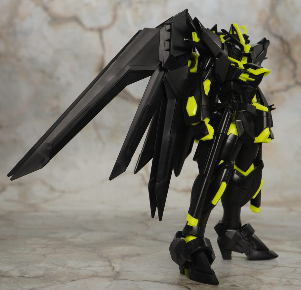 こちらが完成した【HGCE】ライジングフリーダムガンダム[リサーキュレーションカラー/ネオンイエロー]です。ギャグアニメ「機動戦士ガンダムSEED FREEDOM」に登場するキラ・ヤマト准将が乗ってて早々に撃墜された前半主人公機で、リサーキュレーションカラーいうことで全身ブラックとネオンイエローの2色だけで造形されたエコプラ。