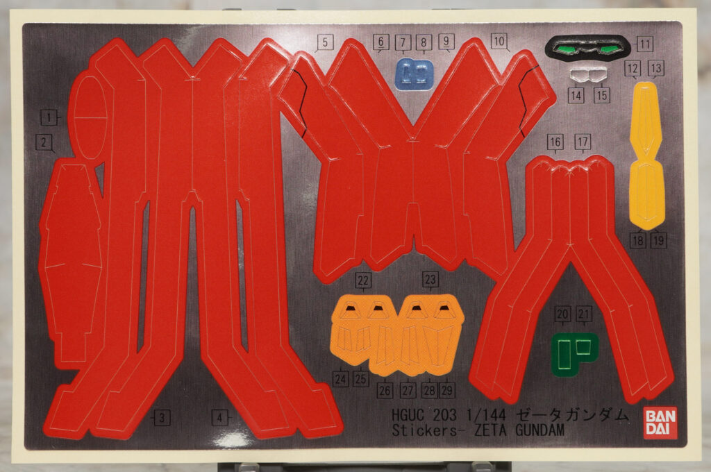 パッケージとシール。通常版と同じ腕や肩などの黄色い部分やバインダーの赤い部分などを色分けするシールが付属。