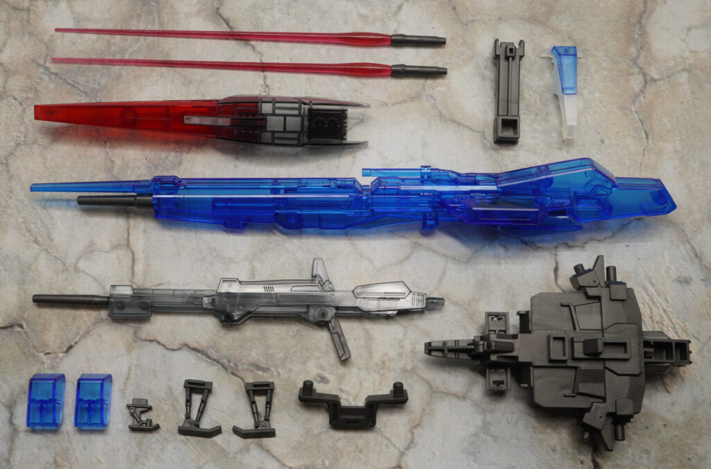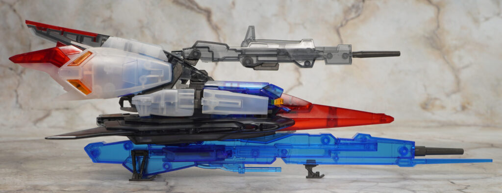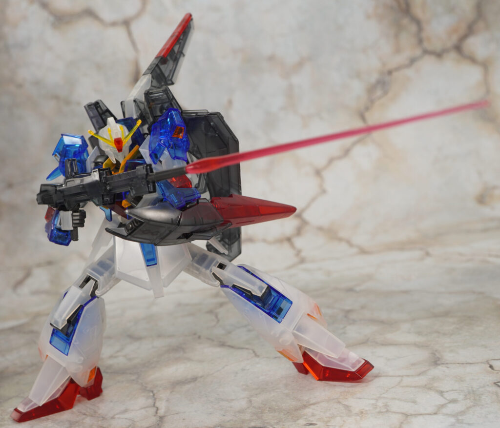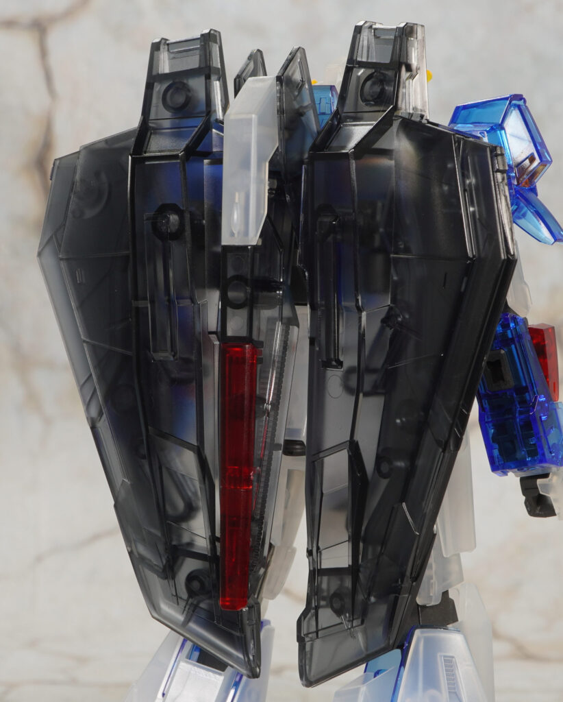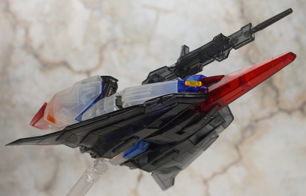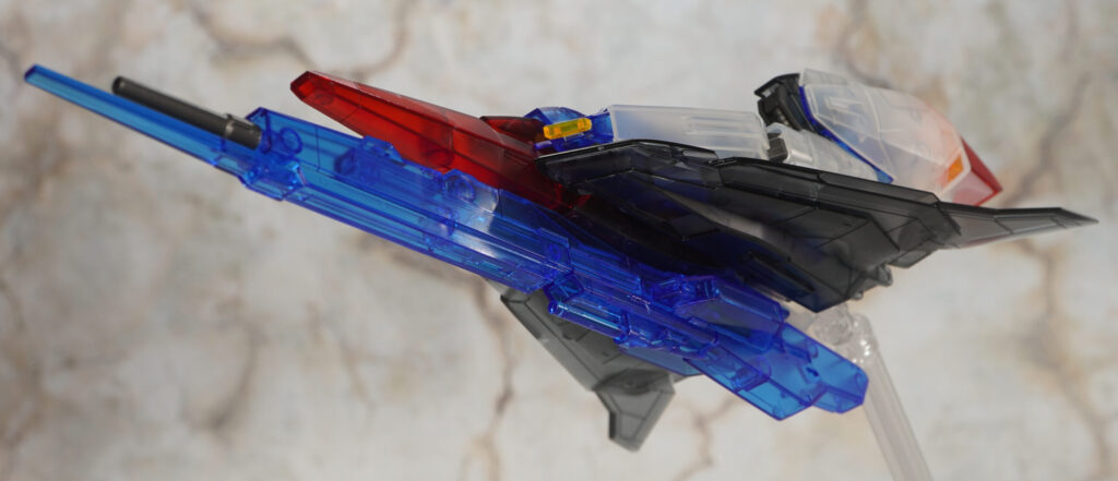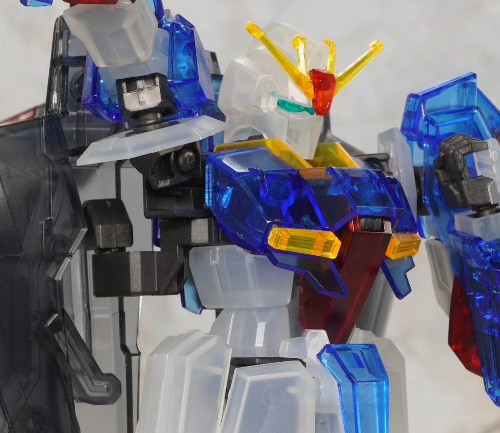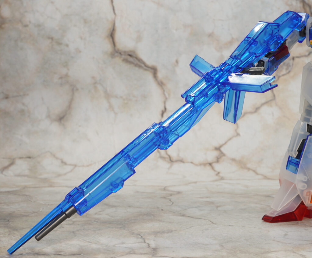 ビーム・ライフルやハイパー・メガ・ランチャー、シールドも透き通るようなクリアパーツで造形。