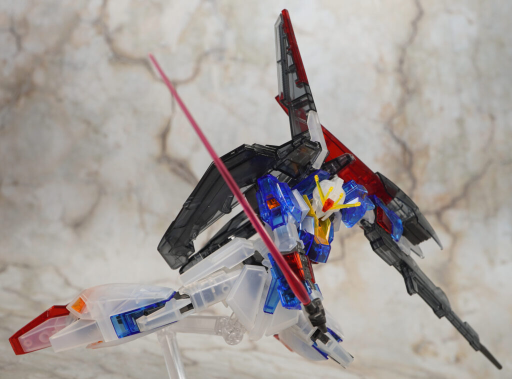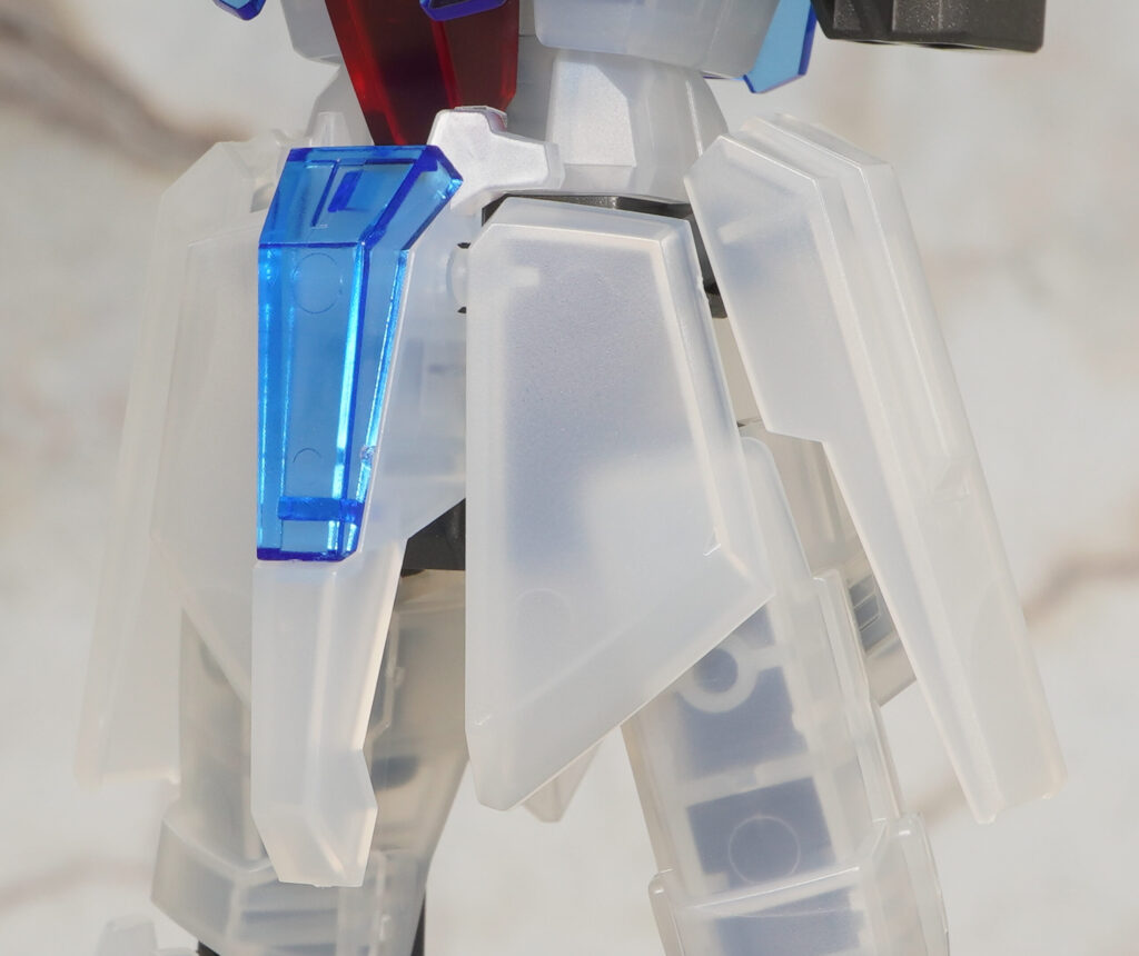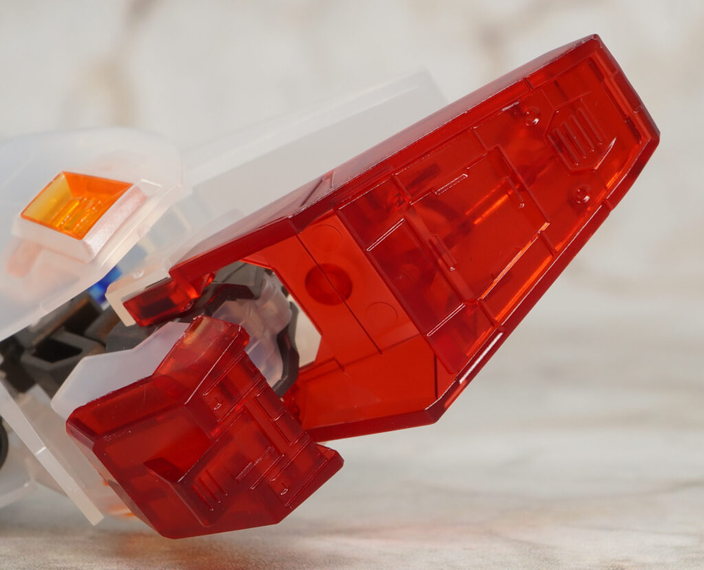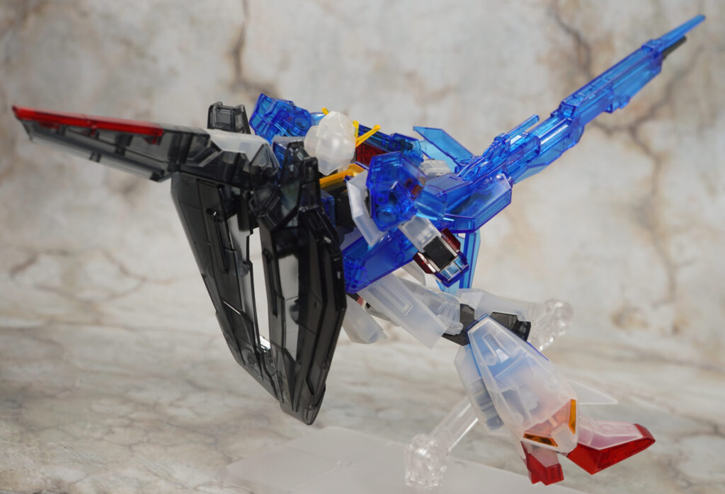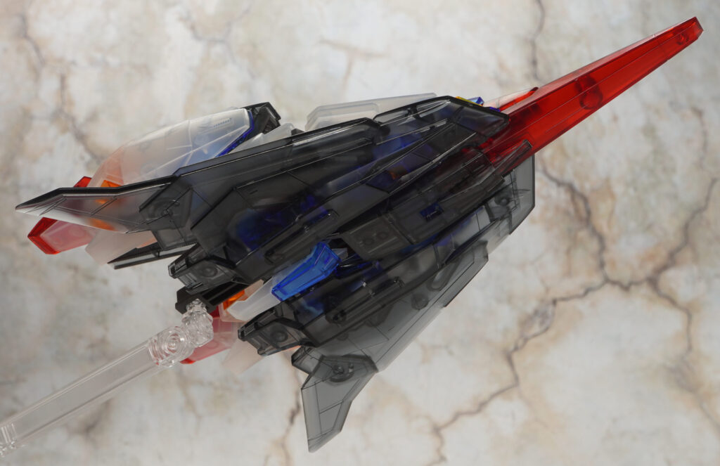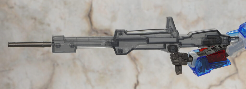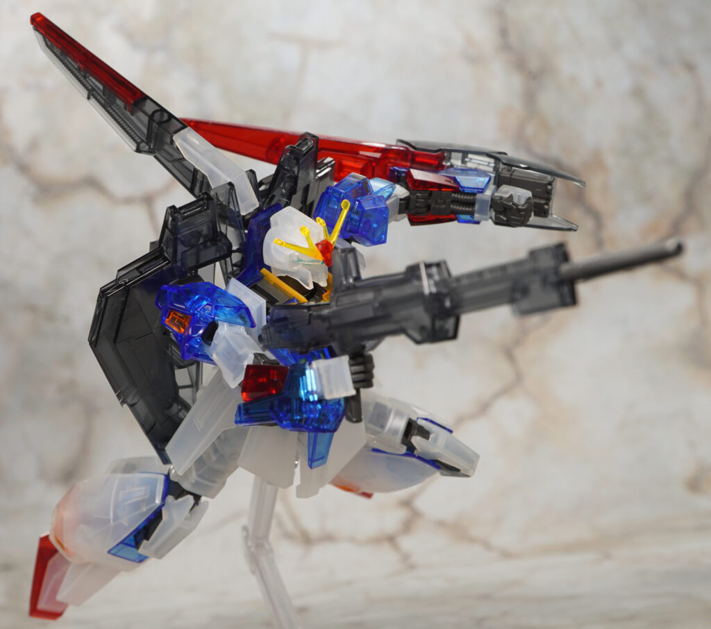 ビーム・ライフルやハイパー・メガ・ランチャー、シールドも透き通るようなクリアパーツで造形。