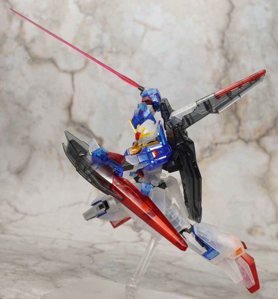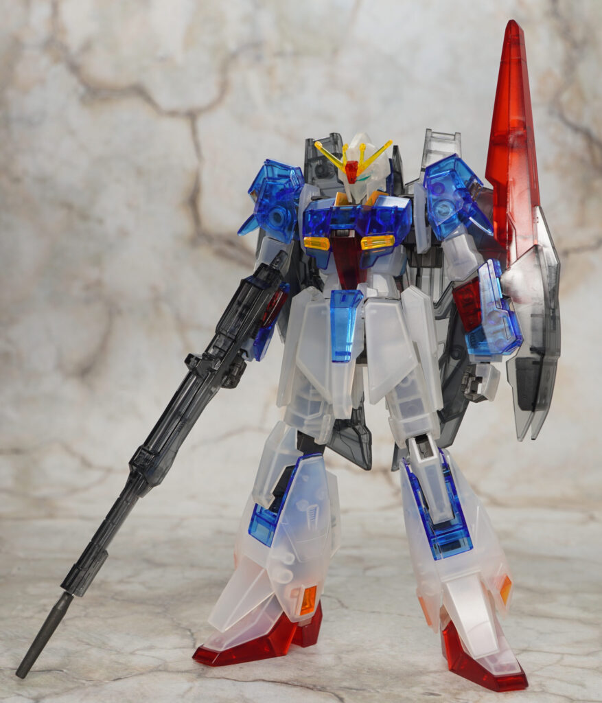 こちらが完成した【HGUC】ゼータガンダム[クリアカラー]です。「機動戦士Zガンダム」や後のガンダムZZに登場するエゥーゴの可変MSゼータガンダムをクリアカラーにしたガンプラ。
