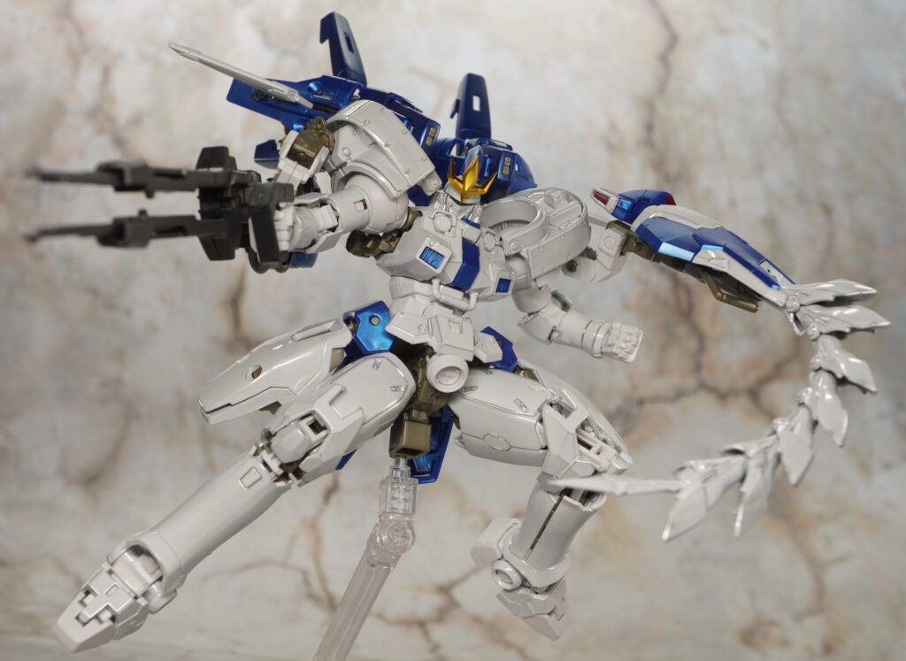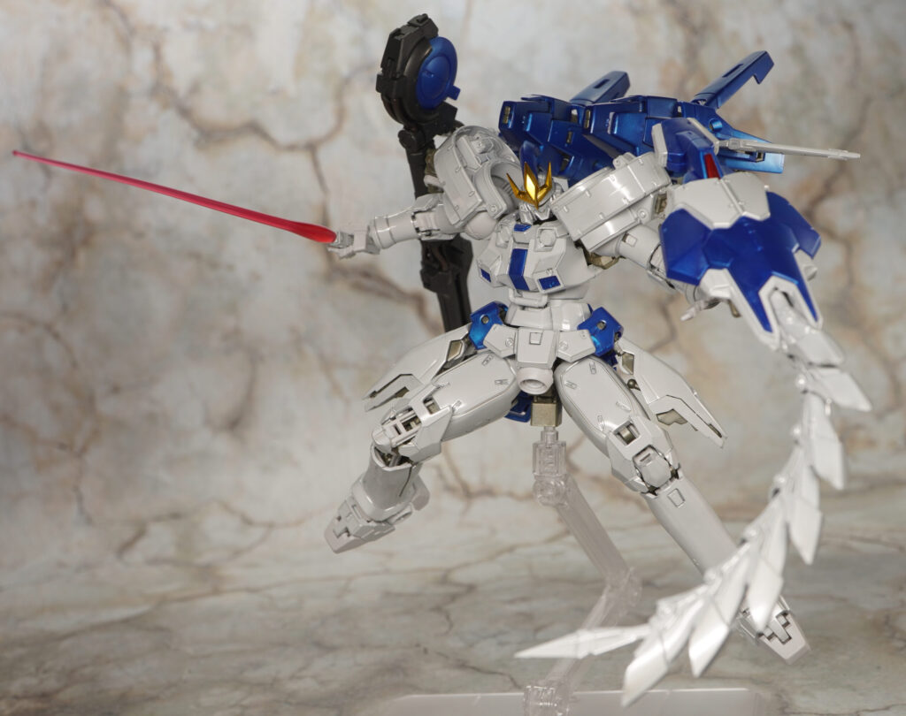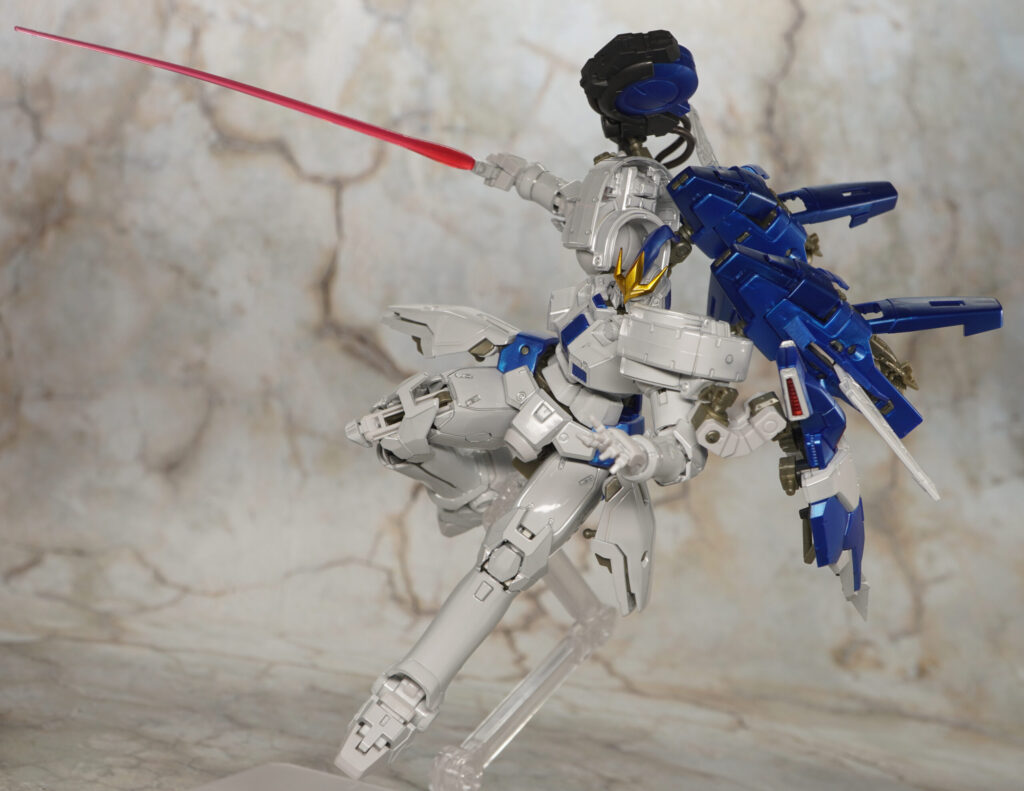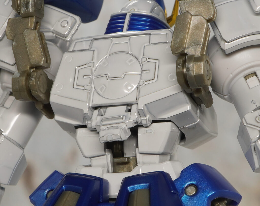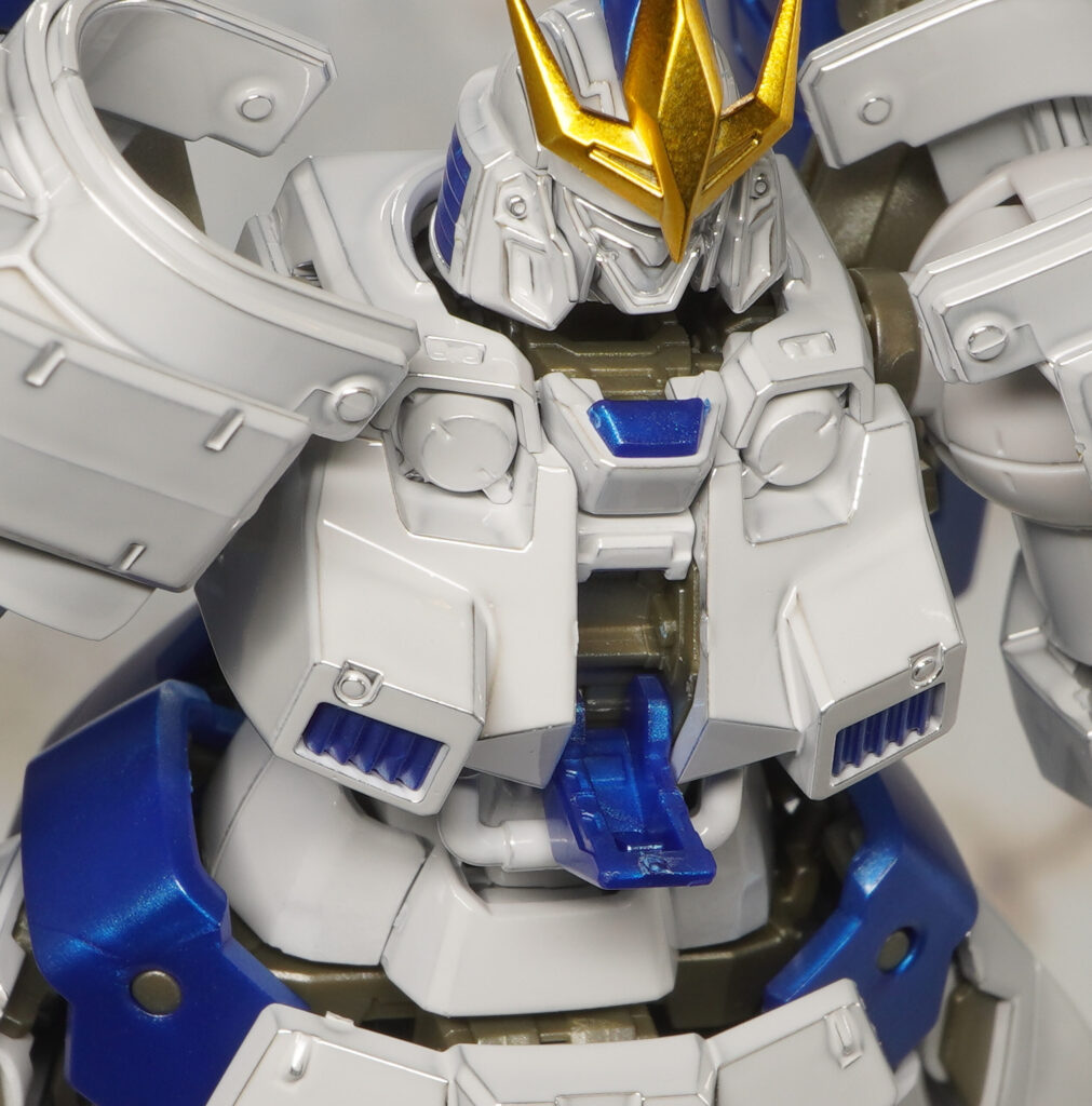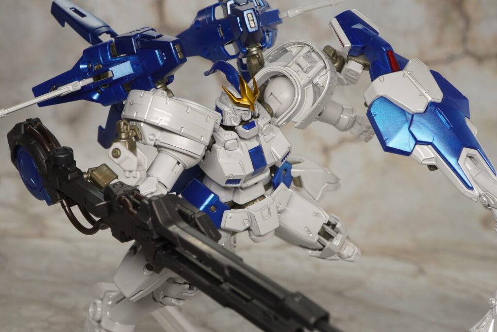 全身の白い装甲がテカテカなチタニウムフィニッシュ仕様になり、関節類や青いパーツはメタリックな成形色で造形されているぞ!