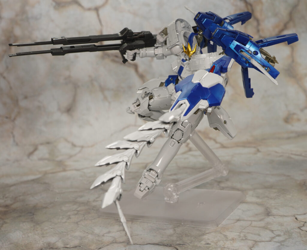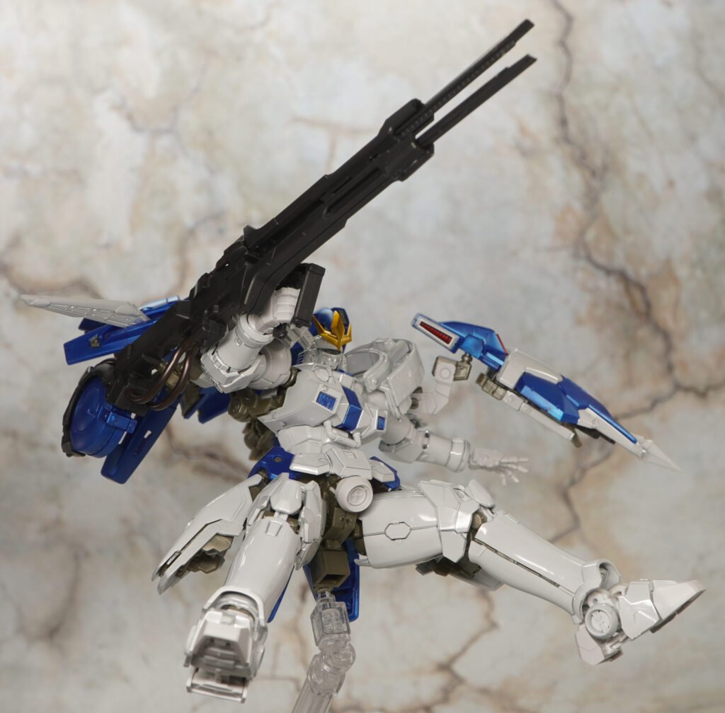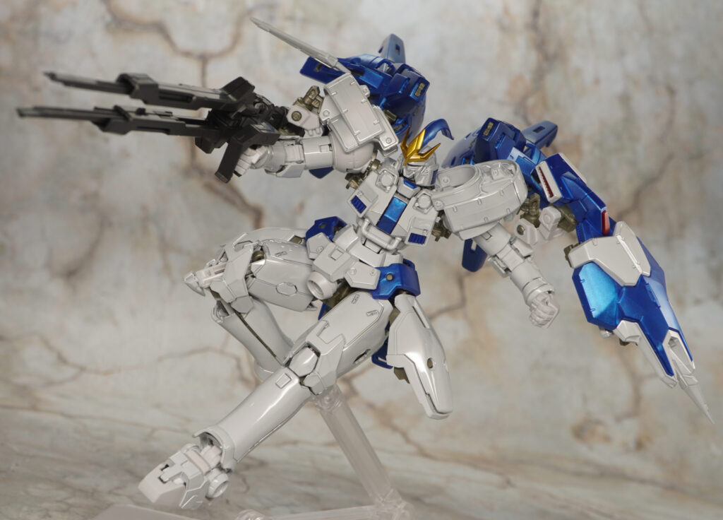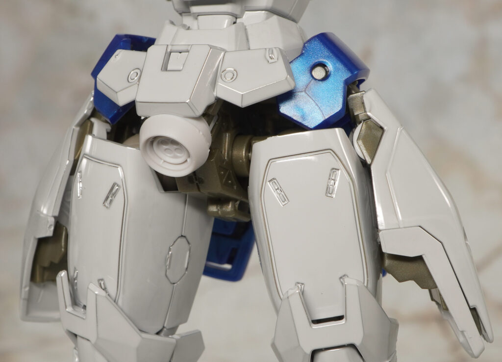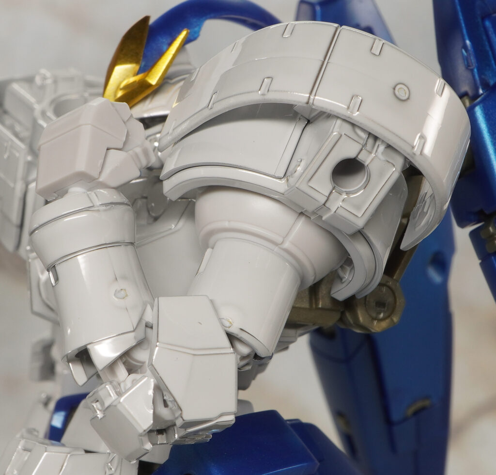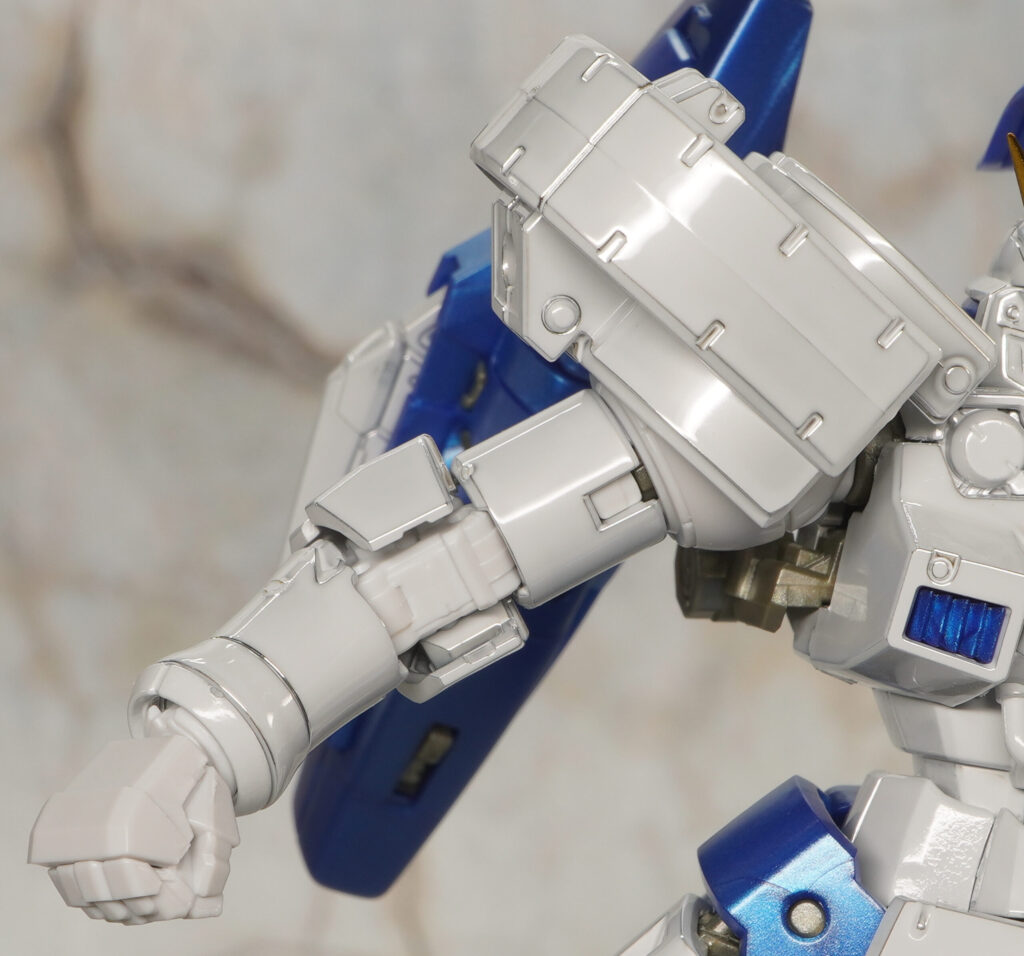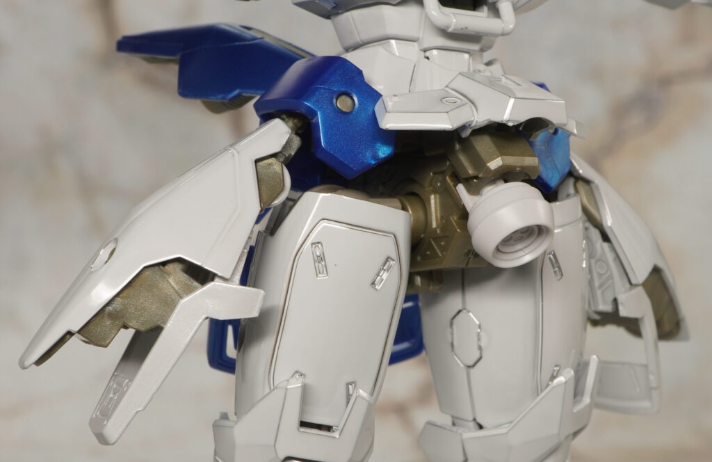 元々はEW版トールギスなのでヒジやヒザ、足首にアドバンスドMSジョイント12が使われており、それらやハンドパーツなどのKPS部分は非メタリックな色合いです。
